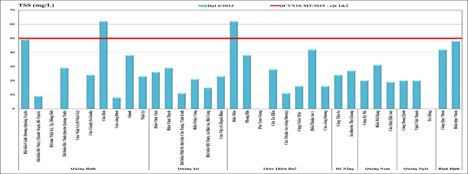 Giá trị TSS đợt 6/2023 tại 36 điểm có giá trị TSS dao động từ <6 – 98 mg/L. Trong đó: có 4/36 điểm vượt QCVN 08 cột A2, chiếm tỷ lệ 11,1% và 3/36 điểm vượt QCVN 08 cột B1, chiếm tỷ lệ 8,3%.