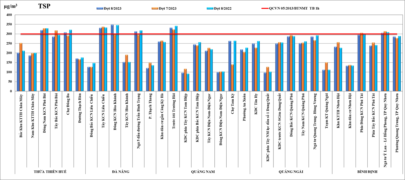 Giá trị TSP dao động trong khoảng từ 97 - 348 µg/m3 và có 7/33 điểm (vị trí) có giá trị TSP vượt ngưỡng giới hạn quy định của QCVN 05 (300 µg/m3) theo trung bình 01 giờ, cao nhất tại điểm đo Đông KCN Hòa Khánh (348 µg/m3).