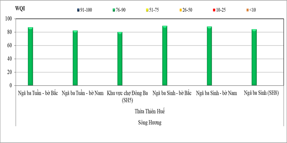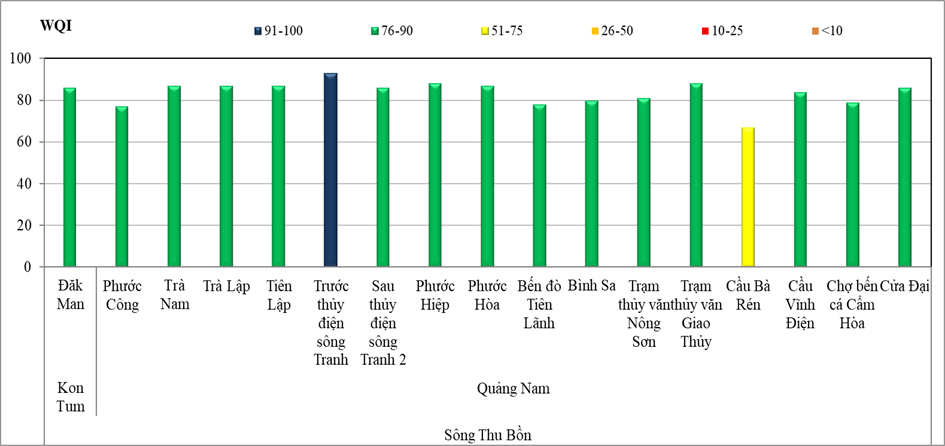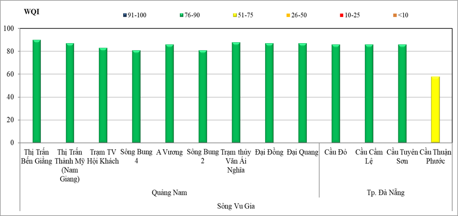 Trong đó, chất lượng nước trên LVS Hương đợt 8/2023 có giá trị VN_WQI nằm trong khoảng 80 – 89, trong khi chất lượng nước trên LVS Vu Gia – Thu Bồn có giá trị VN_WQI nằm trong khoảng 58 – 93.