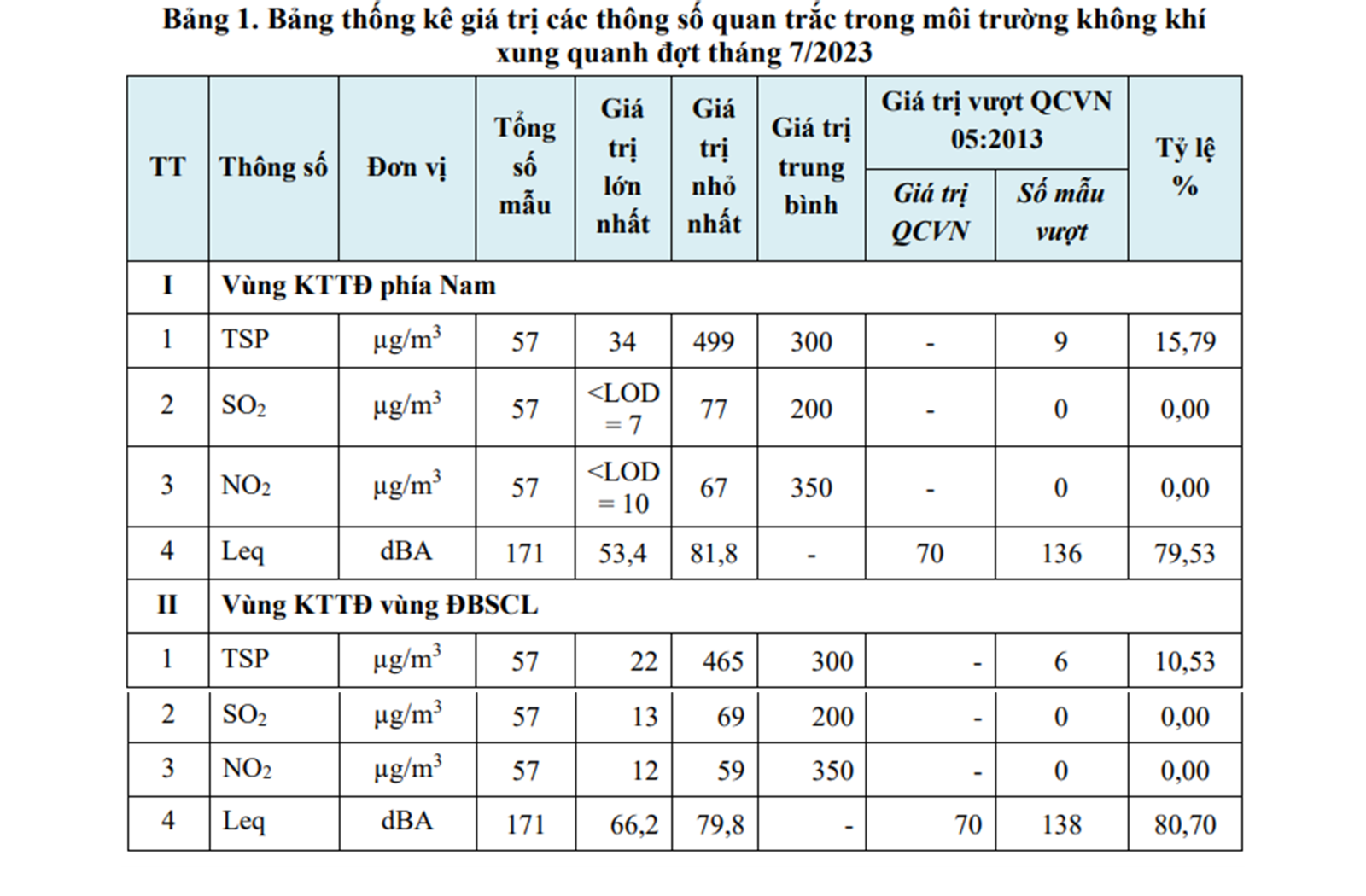 Kết quả quan trắc chất lượng môi trường không khí và nước tại khu vực miền Nam đợt 3/2023 như sau: