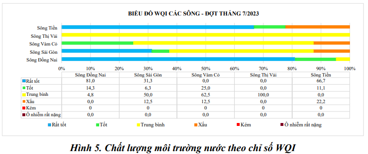 Kết quả quan trắc đợt tháng 7/2023 tại 60 vị trí trên 5 sông khu vực miền Nam cho thấy: sông Đồng Nai, sông Thị Vải thuộc lưu vực hệ thống sông Đồng Nai là các sông có chất lượng nước được duy trì ổn định, còn khá tốt; sông Sài Gòn và sông Vàm Cỏ có chất lượng nước xấu nhất trong các sông được quan trắc ở khu vực miền Nam, đáng chú ý là chất lượng nước sông Tiền thuộc hệ thống sông Mê Kông đợt này bị suy giảm. Cụ thể: