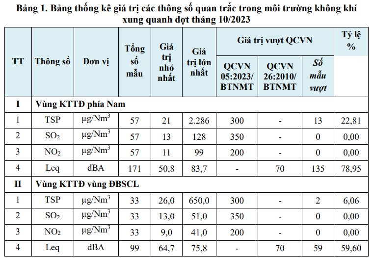 Tại vùng KTTĐ phía Nam, giá trị TSP đợt tháng 10/2023 tại vùng KTTĐ phía Nam dao động từ 21 µg/Nm3 – 2.286 µg/Nm3, trong khi giá trị Leq trung bình dao động từ 50,8 dBA – 83,7 dBA.