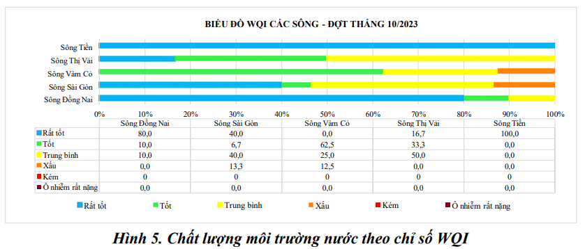 Kết quả quan trắc đợt tháng 10/2023 tại 58 vị trí trên 5 sông khu vực miền Nam cho thấy chất lượng nước có xu hướng cải thiện, sông Đồng Nai, sông Thị Vải thuộc lưu vực hệ thống sông Đồng Nai và sông Tiền có chất lượng nước khá tốt; sông Vàm Cỏ và sông Sài Gòn có chất lượng nước xấu nhất trong các sông được quan trắc ở khu vực miền Nam.