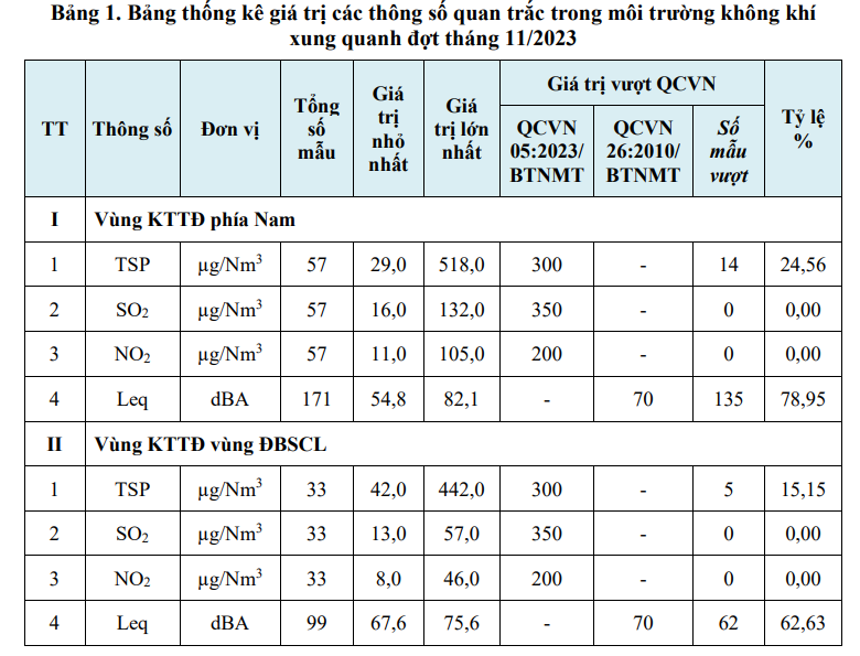 Tại vùng KTTĐ phía Nam, giá trị TSP dao động trong khoảng 29 µg/Nm3 – 518 µg/Nm3, trong khi đó, giá trị Leq trung bình dao động từ 54,8 dBA – 82,1 dBA.
