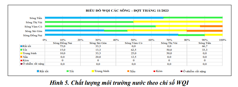 Kết quả quan trắc đợt tháng 11/2023 tại 58 vị trí trên 5 sông khu vực miền Nam cho thấy chất lượng nước có xu hướng giảm, sông Đồng Nai, sông Thị Vải thuộc lưu vực hệ thống sông Đồng Nai và sông Tiền có chất lượng nước khá tốt; sông Vàm Cỏ và sông Sài Gòn có chất lượng nước xấu nhất trong các sông được quan trắc ở khu vực miền Nam.