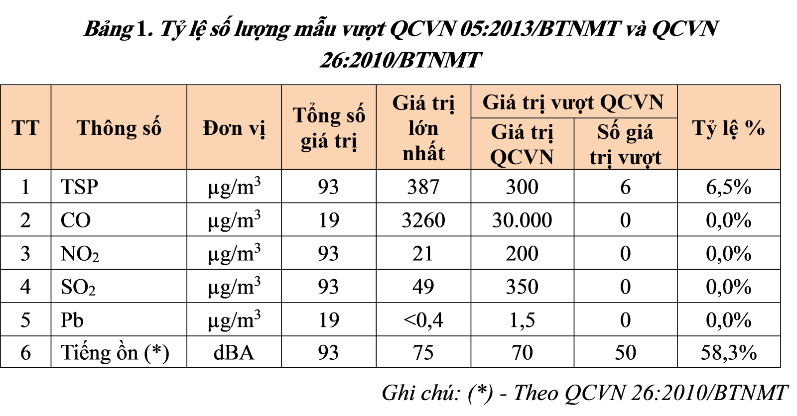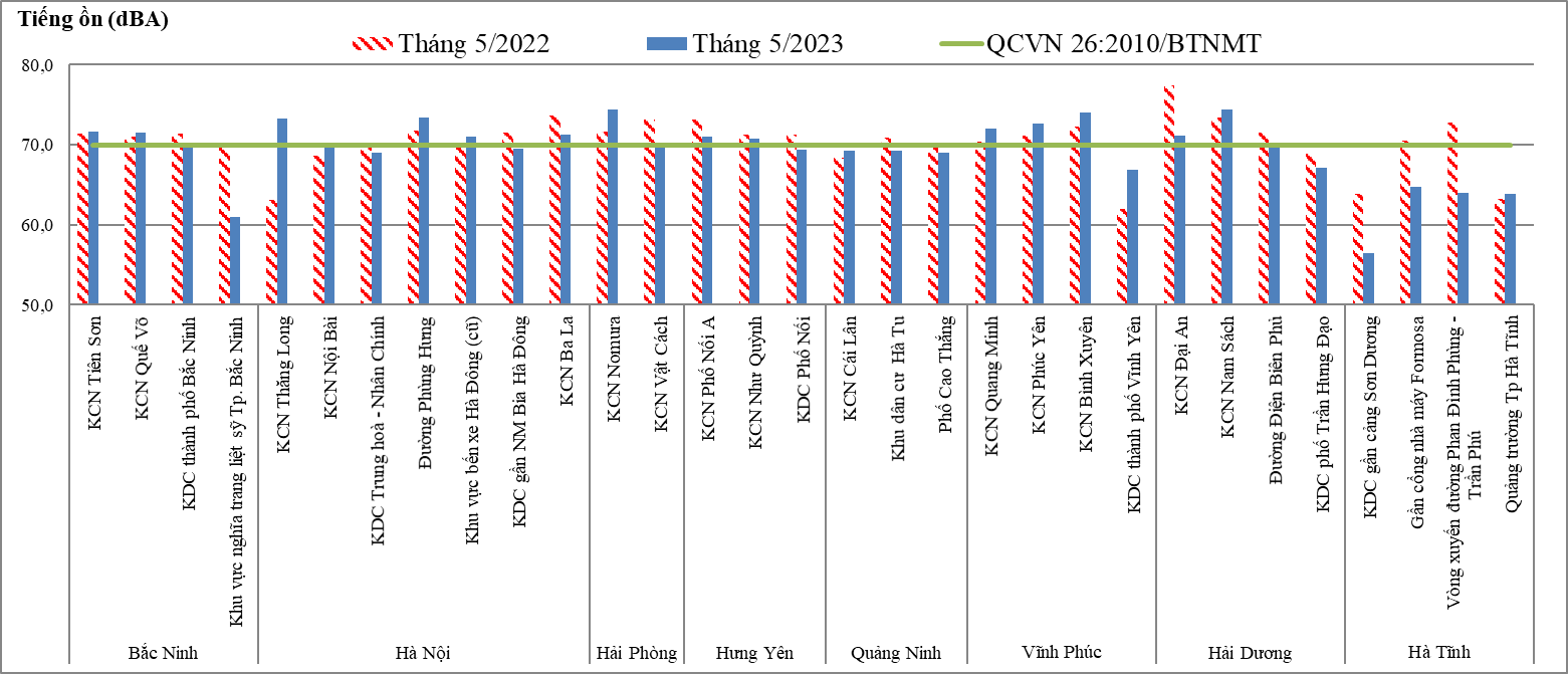 Kết quả quan trắc tiếng ồn cho thấy, có 16/31 vị trí có tiếng ồn chạm và vượt giới hạn cho phép của QCVN 26:2010/BTNMT (70dBA, áp dụng với khung thời gian từ 6-21h).