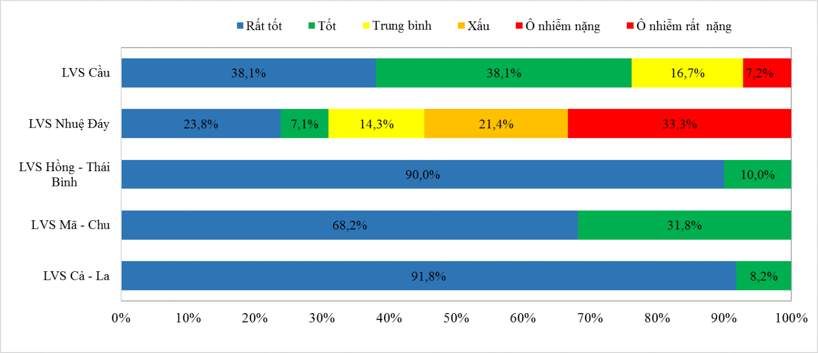 Chất lượng môi trường nước LVS Cầu: Trong 42 điểm quan trắc có 76,2% số điểm cho chất lượng nước sông đạt mức tốt đến rất tốt (WQI >76); 16,7% số điểm ở mức trung bình; 0,0% số điểm ở mức kém và 7,1% số điểm ở mức ô nhiễm đến ô nhiễm rất nặng. Giá trị WQI trung bình trên toàn LVS Cầu là 79.