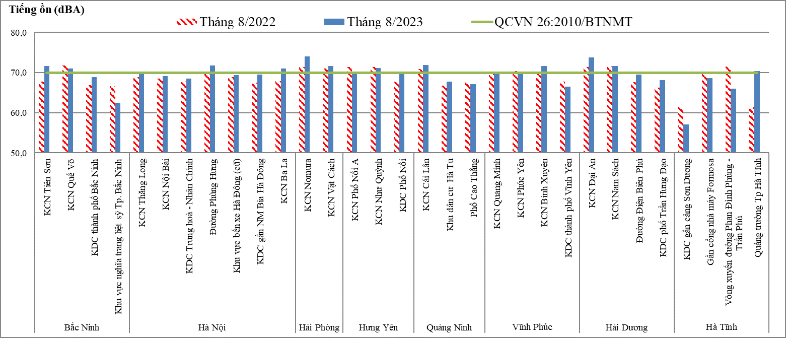 Kết quả quan trắc tiếng ồn, Đợt 06/2023 cho thấy, có 14/31 vị trí có tiếng ồn chạm và vượt giới hạn cho phép của QCVN 26:2010/BTNMT (70dBA, áp dụng với khung thời gian từ 6-21h). Mức ồn cao, vượt giới hạn cho phép ghi nhận tại các điểm quan trắc gần các KCN và trục giao thông.