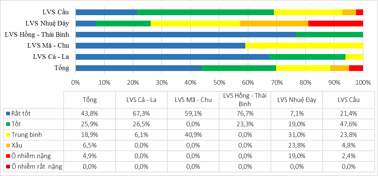 Chất lượng môi trường nước LVS Hồng - Thái Bình, Đà: tiếp tục duy trì mức tốt, nước sông sử dụng tốt cho mục đích cấp nước sinh hoạt, nuôi trồng thủy sản, tưới tiêu và các mục đích tương đương khác (WQI: 83-100).