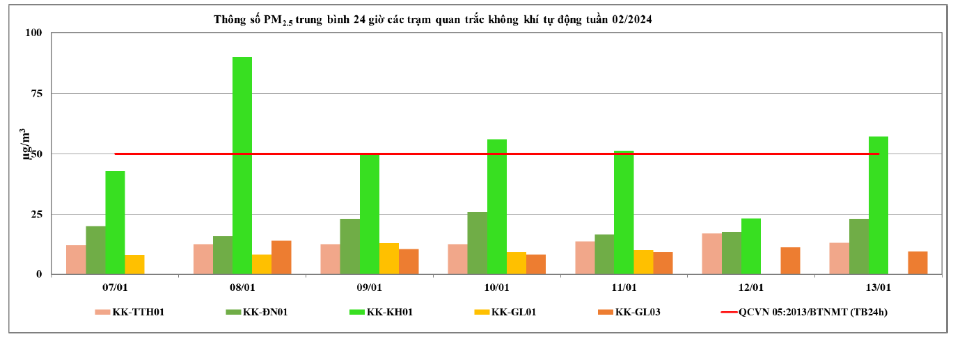 Căn cứ số liệu của 09 Trạm quan trắc tự động thuộc mạng lưới quan trắc môi trường quốc gia và địa phương tại khu vực miền Trung và Tây Nguyên do Trung tâm Quan trắc môi trường miền Trung và Tây Nguyên thực hiện từ ngày 07/01/2024 đến ngày 13/01/2024 (trong đó, 03 Trạm do Cục Kiểm soát ô nhiễm môi trường quản lý: Trạm 83 Hùng Vương - Thừa Thiên Huế (KK-TTH01), Trạm 41 Lê Duẩn - Đà Nẵng (KK-ĐN01), Trạm Vĩnh Hoà - Khánh Hoà (KK-KH01); 02 Trạm do Tổng cục Khí tượng thuỷ văn quản lý: Trạm Hoà Thuận Tây - Đà Nẵng (KK-ĐN02), Trạm Phù Đổng - Gia Lai (KK-GL04) quan trắc thông số bụi PM và 04 Trạm do địa phương quản lý: Trạm TTQT TN&MT - Tp. Pleiku (KK-GL01); Trạm UBND Thị Xã An Khê (KK-GL02); Trạm BQL KCN Trà Đa (KKGL03); Trạm Chư Sê (KK-GL5) thuộc tỉnh Gia Lai cho thấy chất lượng môi trường không khí tại khu vực miền Trung và Tây Nguyên tại các Trạm quan trắc thuộc khu vực miền Trung và Tây Nguyên dao động ở mức xấu đến tốt (Tại thời điểm ngày 16/01, có 04/09 trạm có số liệu nhận được trên 80% theo quy định (Trạm BQL KCN Trà Đa (KKGL03), Trạm 41 Lê Duẩn - Đà Nẵng (KK-ĐN01), Trạm 83 Hùng Vương - Thừa Thiên Huế (KK-TTH01) và Trạm Vĩnh Hoà - Khánh Hoà (KK-KH01)). Số liệu của Trạm TTQT TN&MT - Tp. Pleiku (KK-GL01) tỉ lệ dữ liệu nhận được khoảng 77%. Thông số PM2.5 (TB24h) vượt QCVN 05:2013/BTNMT từ ngày 08/01, ngày 10/01 đến 11/01 và ngày 13/01 tại Trạm Vĩnh Hòa – Khánh Hòa (KK-KH01); thông số O3 (TB 8h) tại Trạm 41 Lê Duẩn - Đà Nẵng (KK-ĐN01) vượt QCVN 05:2023/BTNMT vào một số thời điểm trong ngày. Các thông số đặc trưng khác trong môi trường không khí xung quanh như NO2, CO và SO2 trong tuần nhỏ hơn giới hạn cho phép theo QCVN 05:2023/BTNMT (TB 24h)). Kết quả cụ thể chất lượng không khí tuần 2 năm 2024 thể hiện tại Biểu đồ 1 dưới đây.