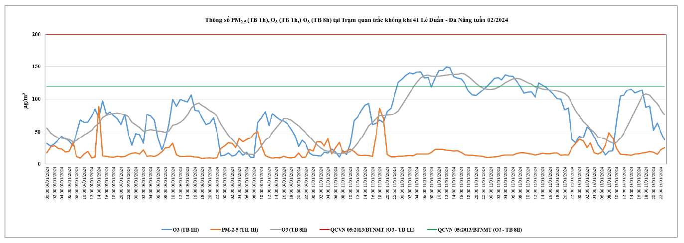 Biểu đồ 2. Diễn biến giá trị PM2.5 (TB 1h), O3 (TB 1h), O3 (TB 8h) tại Trạm 41 Lê Duẩn - Đà Nẵng (KK-ĐN01)