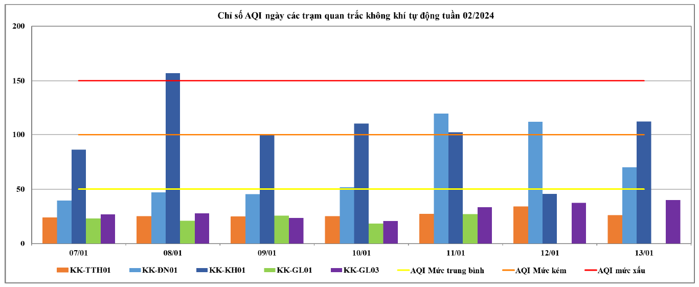 Kết quả cụ thể tại các trạm quan trắc: Trạm Vĩnh Hòa - Khánh Hòa (KK-KH01) có chất lượng môi trường không khí dao động ở mức xấu đến mức tốt, cụ thể: Ngày 08/01 ghi nhận mức xấu (VN_AQI: 151-200) chiếm tỷ lệ 14,3%, ngày 10/01, 11/01, 13/01 ghi nhận mức kém (VN_AQI: 101-150) chiếm tỷ lệ 42,9%, ngày 07/01, 09/01 ghi nhận mức trung bình (VN_AQI: 51-100) chiếm tỷ lệ 28,6% và ngày 12/01 ghi nhận mức tốt (VN_AQI: 0-50), chiếm tỷ lệ 14,3%; Trạm 41 Lê Duẩn - Đà Nẵng (KK-ĐN01) có chất lượng môi trường không khí dao động ở mức kém đến mức tốt, cụ thể: Ngày 11/01 đến 12/01 ghi nhận mức kém (VN_AQI: 101-150) chiếm tỷ lệ 28,6%, ngày 10/01, 13/01 ghi nhận mức trung bình (VN_AQI: 51- 100) chiếm tỷ lệ 28,6% và ngày 07/01 đến 09/01 ghi nhận mức tốt (VN_AQI: 0-50), chiếm tỷ lệ 42,9%; Các trạm còn lại có chất lượng môi trường không khí ở mức tốt (VN_AQI: 0-50). Chỉ số VN_AQI ngày tại một số Trạm khu vực miền Trung và Tây Nguyên chi tiết thể hiện tại Bảng 1.