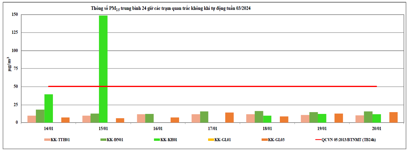 Căn cứ số liệu của 09 Trạm quan trắc tự động thuộc mạng lưới quan trắc môi trường quốc gia và địa phương tại khu vực miền Trung và Tây Nguyên do Trung tâm Quan trắc môi trường miền Trung và Tây Nguyên thực hiện từ ngày 14/01/2024 đến ngày 20/01/2024 (trong đó, 03 Trạm do Cục Kiểm soát ô nhiễm môi trường quản lý: Trạm 83 Hùng Vương - Thừa Thiên Huế (KK-TTH01), Trạm 41 Lê Duẩn - Đà Nẵng (KK-ĐN01), Trạm Vĩnh Hoà - Khánh Hoà (KK-KH01); 02 Trạm do Tổng cục Khí tượng thuỷ văn quản lý: Trạm Hoà Thuận Tây - Đà Nẵng (KK-ĐN02), Trạm Phù Đổng - Gia Lai (KK-GL04) quan trắc thông số bụi PM và 04 Trạm do địa phương quản lý: Trạm TTQT TN&MT - Tp. Pleiku (KK-GL01); Trạm UBND Thị Xã An Khê (KK-GL02); Trạm BQL KCN Trà Đa (KKGL03); Trạm Chư Sê (KK-GL5) thuộc tỉnh Gia Lai cho thấy chất lượng môi trường không khí tại khu vực miền Trung và Tây Nguyên tại các Trạm quan trắc thuộc khu vực miền Trung và Tây Nguyên dao động ở mức xấu đến tốt (Tại thời điểm ngày 23/01, có 03/09 trạm có số liệu nhận được trên 80% theo quy định (Trạm 41 Lê Duẩn - Đà Nẵng (KK-ĐN01), Trạm 83 Hùng Vương - Thừa Thiên Huế (KK-TTH01) và Trạm Vĩnh Hoà - Khánh Hoà (KK-KH01). Số liệu của Trạm BQL KCN Trà Đa (KK-GL03) tỉ lệ dữ liệu nhận được khoảng 78%. Thông số PM2.5 (TB24h) vượt QCVN 05:2023/BTNMT ngày 15/01 tại Trạm Vĩnh Hòa – Khánh Hòa (KK-KH01). Các thông số đặc trưng khác trong môi trường không khí xung quanh như NO2, CO và SO2 trong tuần nhỏ hơn giới hạn cho phép theo QCVN 05:2023/BTNMT (TB 24h)). Kết quả cụ thể chất lượng không khí tuần 3 năm 2024 thể hiện tại Biểu đồ 1 dưới đây.