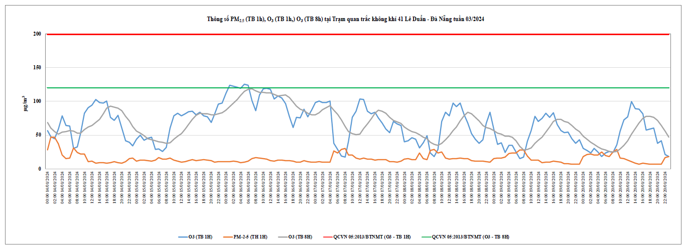 Biểu đồ 2. Diễn biến giá trị PM2.5 (TB 1h), O3 (TB 1h), O3 (TB 8h) tại Trạm 41 Lê Duẩn - Đà Nẵng (KK-ĐN01)