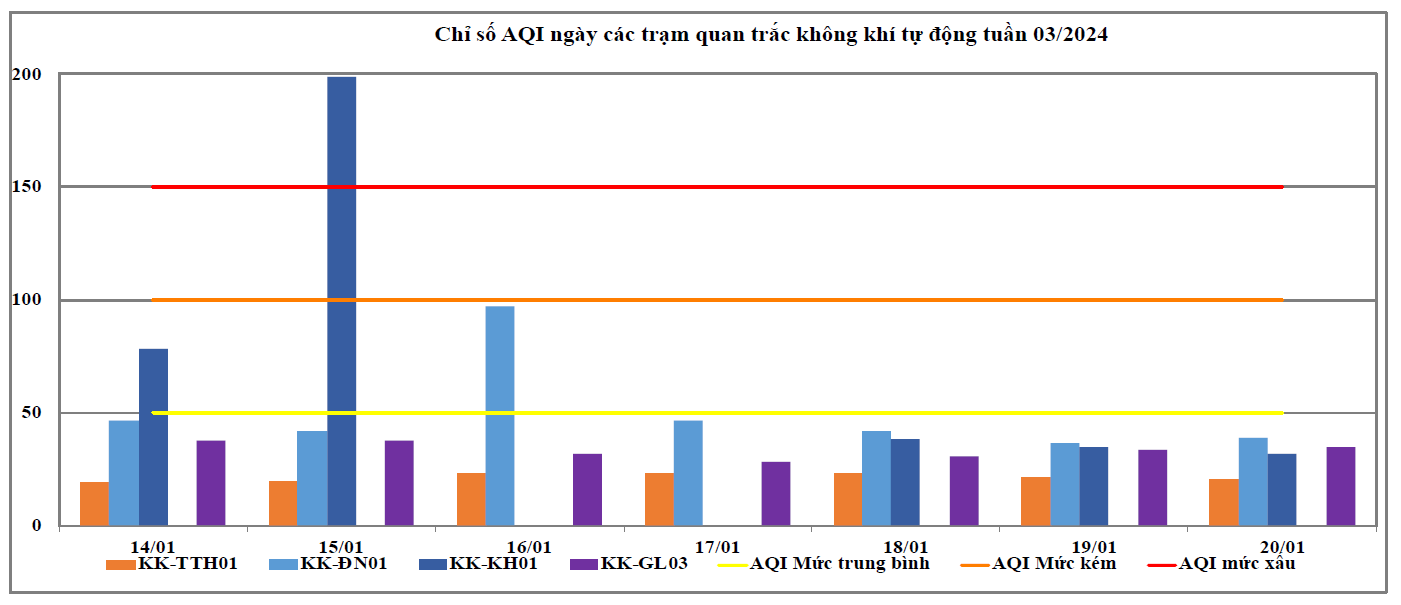 Kết quả cụ thể tại các trạm quan trắc: Trạm Vĩnh Hòa - Khánh Hòa (KK-KH01) có chất lượng môi trường không khí dao động ở mức xấu đến mức tốt, cụ thể: Ngày 14/01 ghi nhận mức trung bình (VN_AQI: 51-100) chiếm tỷ lệ 20%, ngày 15/01 ghi nhận mức xấu mức xấu (VN_AQI: 151-200) chiếm tỉ lệ 20%, ngày 18/01, 19/01, 20/01 ghi nhận mức tốt (VN_AQI: 0-50) chiếm tỷ lệ 60%. Trạm 41 Lê Duẩn - Đà Nẵng (KK-ĐN01) có chất lượng môi trường không khí dao động ở mức trung bình đến tốt, cụ thể: ngày 16/01 ghi nhận mức trung bình (VN_AQI: 51- 100); các ngày còn lại ghi nhận mức tốt. Các trạm còn lại có chất lượng môi trường không khí ở mức tốt (VN_AQI: 0-50). Chỉ số VN_AQI ngày tại một số Trạm khu vực miền Trung và Tây Nguyên chi tiết thể hiện tại Bảng 1.