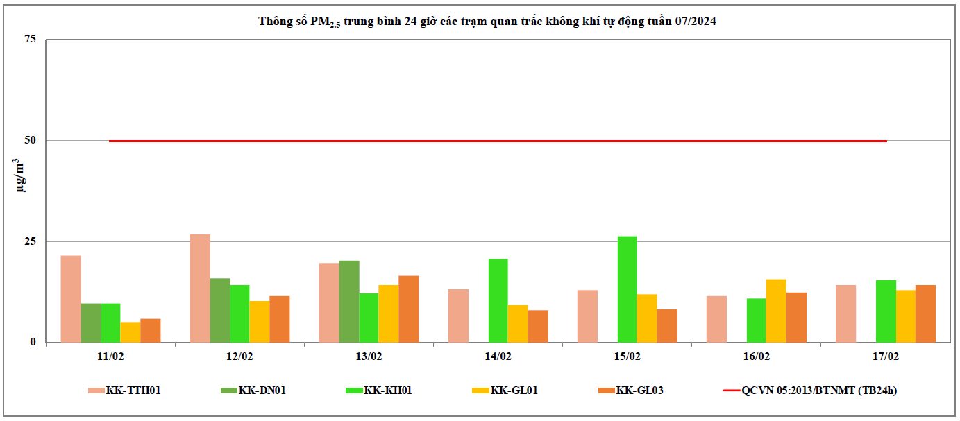 Căn cứ số liệu của 09 Trạm quan trắc tự động thuộc mạng lưới quan trắc môi trường quốc gia và địa phương tại khu vực miền Trung và Tây Nguyên do Trung tâm Quan trắc môi trường miền Trung và Tây Nguyên thực hiện từ ngày 11/02/2024 đến ngày 17/02/2024 (trong đó, 03 Trạm do Cục Kiểm soát ô nhiễm môi trường quản lý: Trạm 83 Hùng Vương - Thừa Thiên Huế (KK-TTH01), Trạm 41 Lê Duẩn - Đà Nẵng (KK-ĐN01), Trạm Vĩnh Hoà - Khánh Hoà (KK-KH01); 02 Trạm do Tổng cục Khí tượng thuỷ văn quản lý: Trạm Hoà Thuận Tây - Đà Nẵng (KK-ĐN02), Trạm Phù Đổng - Gia Lai (KK-GL04) quan trắc thông số bụi PM và 04 Trạm do địa phương quản lý: Trạm TTQT TN&MT - Tp. Pleiku (KK-GL01); Trạm UBND Thị Xã An Khê (KK-GL02); Trạm BQL KCN Trà Đa (KKGL03); Trạm Chư Sê (KK-GL5) thuộc tỉnh Gia Lai cho thấy chất lượng môi trường không khí tại khu vực miền Trung và Tây Nguyên tại các Trạm quan trắc thuộc khu vực miền Trung và Tây Nguyên dao động ở mức trung bình đến tốt (Tại thời điểm ngày 19/02, có 04/09 trạm có số liệu nhận được trên 80% theo quy định, cụ thể: Trạm 83 Hùng Vương - Thừa Thiên Huế (KK-TTH01), Trạm Vĩnh Hoà – Khánh Hoà (KK-KH01), Trạm TTQT TN&MT - Tp. Pleiku (KK-GL01) và Trạm BQL KCN Trà Đa (KK-GL03). Số liệu của Trạm 41 Lê Duẩn - Đà Nẵng (KK-ĐN01) tỉ lệ dữ liệu nhận được khoảng 49,13%. Các thông số đặc trưng trong môi trường không khí xung quanh như: NO2, CO và SO2 trong tuần nhỏ hơn giới hạn cho phép theo QCVN 05:2023/BTNMT (TB 24h)). Kết quả cụ thể chất lượng không khí tuần 7 năm 2024 thể hiện tại Biểu đồ 1 dưới đây.