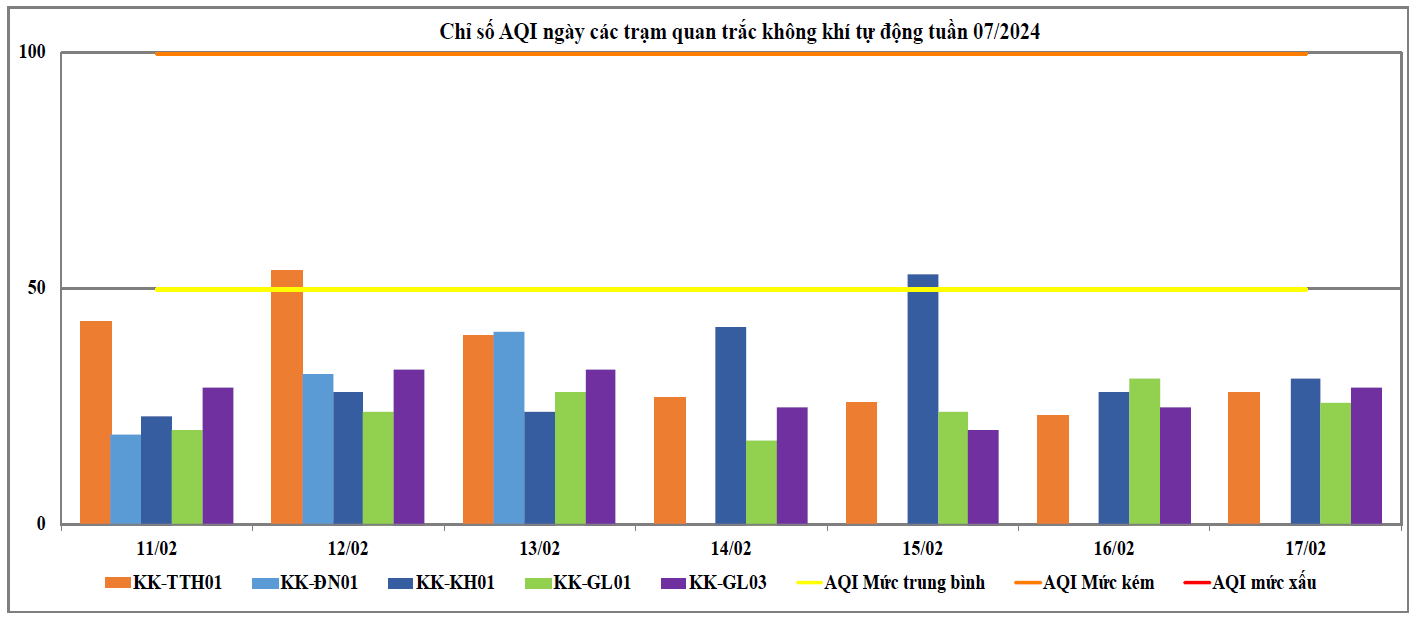 Kết quả cụ thể tại các trạm quan trắc: Trạm TTQT TN&MT - Tp. Pleiku (KK-GL01), BQL KCN Trà Đa (KK-GL03) có chất lượng môi trường không khí ghi nhận mức tốt (VN_AQI: 0 - 50) chiếm tỉ lệ 100%; Trạm 83 Hùng Vương - Thừa Thiên Huế (KK-TTH01) có chất lượng môi trường không khí dao động ở mức trung bình đến tốt, cụ thể: ngày 12/02 ghi nhận mức trung bình (VN_AQI: 50 – 100) chiếm tỉ lệ 14,3%, từ ngày 11/02, ngày 13/02 đến ngày 17/02 ghi nhận mức tốt (VN_AQI: 0 - 50) chiếm tỉ lệ 85,7%; Trạm Vĩnh Hoà - Khánh Hoà (KK-KH01) có chất lượng môi trường không khí ở mức trung bình đến tốt, cụ thể: ngày 15/02 ghi nhận mức trung bình (VN_AQI: 50 – 100) chiếm tỉ lệ 14,3%, từ ngày 11/02 đến ngày 14/02, từ ngày 16/02 đến ngày 17/02 ghi nhận mức tốt (VN_AQI: 0 - 50) chiếm tỉ lệ 85,7%; Trạm 41 Lê Duẩn - Đà Nẵng (KK-ĐN01) có chất lượng môi trường không khí từ ngày 11/02 đến ngày 13/02 ghi nhận mức tốt (VN_AQI: 0 - 50) chiếm tỉ lệ 42,9%, từ ngày 14/02 đến ngày 17/02 bị mất kết nối. Chỉ số VN_AQI ngày tại một số Trạm khu vực miền Trung và Tây Nguyên chi tiết thể hiện tại Bảng 1.