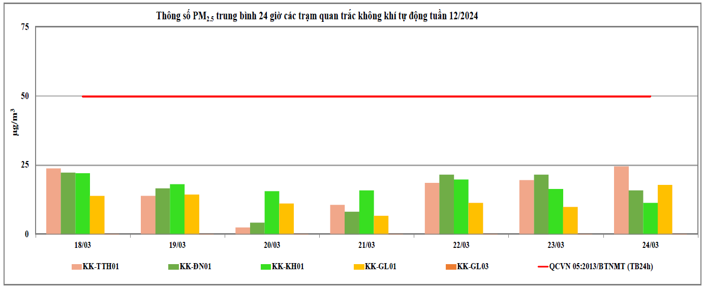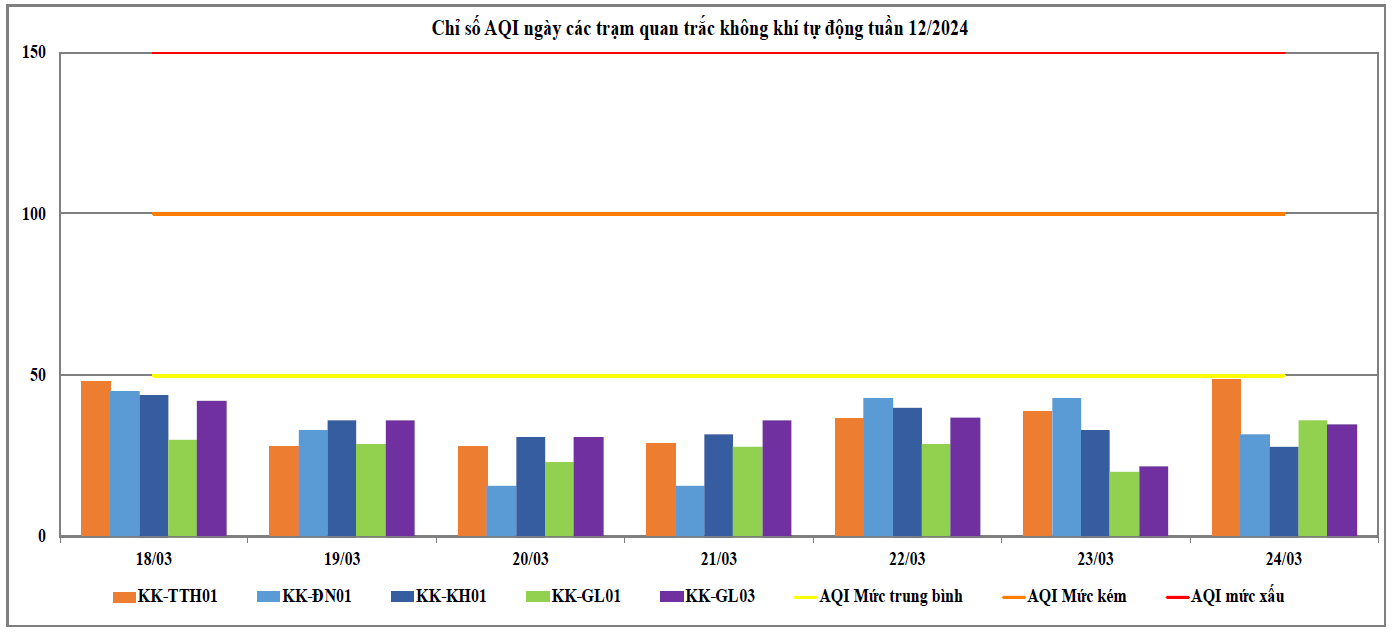 Căn cứ số liệu của 09 Trạm quan trắc tự động thuộc mạng lưới quan trắc môi trường quốc gia và địa phương tại khu vực miền Trung và Tây Nguyên do Trung tâm Quan trắc môi trường miền Trung và Tây Nguyên thực hiện từ ngày 18/03/2024 đến ngày 24/03/2024 (trong đó, 03 Trạm do Cục Kiểm soát ô nhiễm môi trường quản lý: Trạm 83 Hùng Vương - Thừa Thiên Huế (KK-TTH01), Trạm 41 Lê Duẩn - Đà Nẵng (KK-ĐN01), Trạm Vĩnh Hoà - Khánh Hoà (KK-KH01); 02 Trạm do Tổng cục Khí tượng thuỷ văn quản lý: Trạm Hoà Thuận Tây - Đà Nẵng (KK-ĐN02), Trạm Phù Đổng - Gia Lai (KK-GL04) quan trắc thông số bụi PM và 04 Trạm do địa phương quản lý: Trạm TTQT TN&MT - Tp. Pleiku (KK-GL01); Trạm UBND Thị Xã An Khê (KK-GL02); Trạm BQL KCN Trà Đa (KKGL03); Trạm Chư Sê (KK-GL5) thuộc tỉnh Gia Lai) cho thấy chất lượng môi trường không khí tại khu vực miền Trung và Tây Nguyên tại các Trạm quan trắc thuộc khu vực miền Trung và Tây Nguyên dao động ở mức tốt (Tại thời điểm ngày 25/3/2024, có 05/09 trạm có số liệu nhận được trên 80% theo quy định, cụ thể: Trạm Trạm 83 Hùng Vương - Thừa Thiên Huế (KK-TTH01), Trạm Vĩnh Hoà - Khánh Hoà (KK-KH01), Trạm 41 Lê Duẩn - Đà Nẵng (KK-ĐN01), Trạm TTQT TN&MT - Tp. Pleiku (KK-GL01) và Trạm BQL KCN Trà Đa (KK-GL03). Các thông số đặc trưng trong môi trường không khí xung quanh như: NO2, CO và SO2 trong tuần nhỏ hơn giới hạn cho phép theo QCVN 05:2023/BTNMT (TB 24h). Kết quả cụ thể chất lượng không khí tuần 12 năm 2024 thể hiện tại Biểu đồ 1 dưới đây.