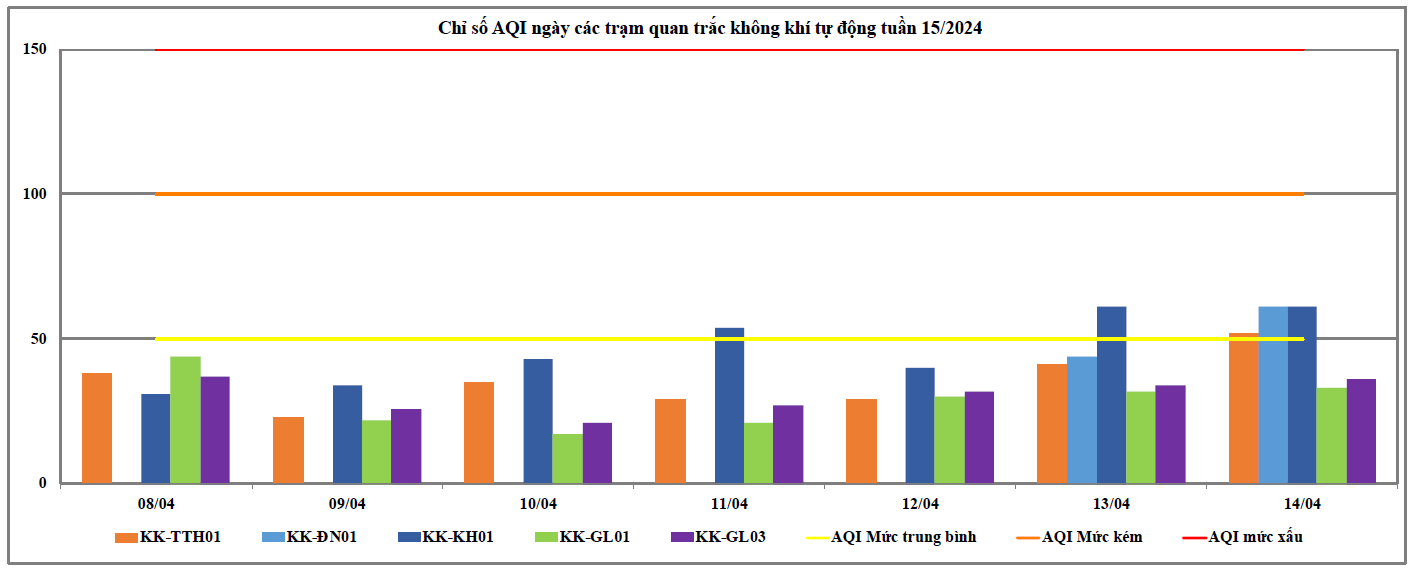 Kết quả cụ thể tại các trạm quan trắc: Trạm 83 Hùng Vương - Thừa Thiên Huế (KK-TTH01) có chất lượng môi trường không khí dao động ở mức tốt, cụ thể: từ ngày 08/04 đến ngày 13/04 ghi nhận mức tốt (VN_AQI: 0 - 50) chiếm tỉ lệ 85,7%; ngày 14/04 ghi nhận mức trung bình (VN_AQI: 51 - 100) chiếm tỉ lệ 14,3%; Trạm Vĩnh Hoà - Khánh Hoà (KK-KH01) có chất lượng môi trường không khí dao động ở mức tốt, cụ thể: từ ngày 08/04 đến ngày 10/04, và ngày 12/04 ghi nhận mức tốt (VN_AQI: 0 - 50) chiếm tỉ lệ 57,1%, ngày 13/04 đến ngày 14/04 ghi nhận mức trung bình (VN_AQI: 51 - 100) chiếm tỉ lệ 42,9%; Trạm 41 Lê Duẩn - Đà Nẵng (KK-ĐN01) có chất lượng môi trường không khí dao động ở mức trung bình đến tốt, cụ thể: ngày 13/04 ghi nhận mức tốt (VN_AQI: 0 - 50) chiếm tỉ lệ 50%, ngày 14/04 ghi nhận mức trung bình (VN_AQI: 51 - 100) chiếm tỉ lệ 50%, từ ngày 08/04 đến ngày 12/04 bị mất kết nối; Trạm TTQT TN&MT - Tp. Pleiku (KK-GL01) và BQL KCN Trà Đa (KK-GL03) có chất lượng môi trường không khí dao động ở mức tốt, cụ thể: từ ngày 08/04 đến ngày 14/04 ghi nhận mức tốt (VN_AQI: 0 - 50) chiếm tỉ lệ 100%. Chỉ số VN_AQI ngày tại một số Trạm khu vực miền Trung và Tây Nguyên chi tiết thể hiện tại Bảng 1.