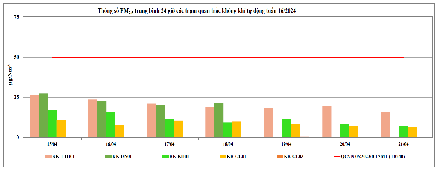 Căn cứ số liệu của 09 Trạm quan trắc tự động thuộc mạng lưới quan trắc môi trường quốc gia và địa phương tại khu vực miền Trung và Tây Nguyên do Trung tâm Quan trắc môi trường miền Trung và Tây Nguyên thực hiện từ ngày 15/04/2024 đến ngày 21/04/2024 (trong đó, 03 Trạm do Cục Kiểm soát ô nhiễm môi trường quản lý: Trạm 83 Hùng Vương - Thừa Thiên Huế (KK-TTH01), Trạm 41 Lê Duẩn - Đà Nẵng (KK-ĐN01), Trạm Vĩnh Hoà - Khánh Hoà (KK-KH01); 02 Trạm do Tổng cục Khí tượng thuỷ văn quản lý: Trạm Hoà Thuận Tây - Đà Nẵng (KK-ĐN02), Trạm Phù Đổng - Gia Lai (KK-GL04) quan trắc thông số bụi PM và 04 Trạm do địa phương quản lý: Trạm TTQT TN&MT - Tp. Pleiku (KK-GL01); Trạm UBND Thị Xã An Khê (KK-GL02); Trạm BQL KCN Trà Đa (KKGL03); Trạm Chư Sê (KK-GL5) thuộc tỉnh Gia Lai cho thấy chất lượng môi trường không khí tại khu vực miền Trung và Tây Nguyên tại các Trạm quan trắc thuộc khu vực miền Trung và Tây Nguyên dao động ở mức trung bình đến tốt (Tại thời điểm ngày 22/04, có 04/09 trạm có số liệu nhận được trên 80% theo quy định, cụ thể: Trạm 83 Hùng Vương - Thừa Thiên Huế (KK-TTH01), Trạm Vĩnh Hoà - Khánh Hoà (KK-KH01), Trạm TTQT TN&MT - Tp. Pleiku (KK-GL01) và Trạm BQL KCN Trà Đa (KK-GL03). Số liệu của Trạm 41 Lê Duẩn - Đà Nẵng (KK-ĐN01) tỉ lệ dữ liệu nhận được khoảng 66,50%. Các thông số đặc trưng trong môi trường không khí xung quanh như: NO2, CO và SO2 trong tuần nhỏ hơn giới hạn cho phép theo QCVN 05:2023/BTNMT (TB 24h)). Kết quả cụ thể chất lượng không khí tuần 16 năm 2024 thể hiện tại Biểu đồ 1 dưới đây.