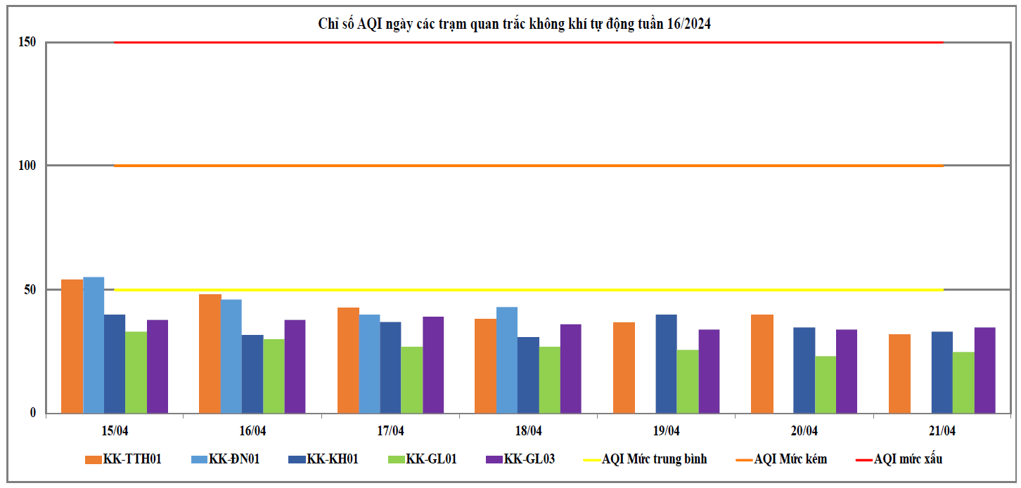 Kết quả cụ thể tại các trạm quan trắc: Trạm Vĩnh Hoà - Khánh Hoà (KK-KH01), Trạm TTQT TN&MT - Tp. Pleiku (KK-GL01), BQL KCN Trà Đa (KK-GL03) có chất lượng môi trường không khí dao động ở mức tốt, cụ thể: từ ngày 15/04 đến ngày 21/04 ghi nhận mức tốt (VN_AQI: 0 - 50) chiếm tỉ lệ 100%; Trạm 83 Hùng Vương - Thừa Thiên Huế (KK-TTH01) có chất lượng môi trường không khí dao động ở mức trung bình đến tốt, cụ thể: Ngày 15/04 ghi nhận mức trung bình (VN_AQI: 51 - 100) chiếm tỉ lệ 14,3%. Từ ngày 16/04 đến ngày 21/04 ghi nhận mức tốt (VN_AQI: 0 - 50) chiếm tỉ lệ 85,75%; Trạm 41 Lê Duẩn - Đà Nẵng (KK-ĐN01) có chất lượng môi trường không khí dao động ở mức trung bình đến tốt, cụ thể: ngày 15/04 ghi nhận mức trung bình (VN_AQI: 51 - 100) chiếm tỉ lệ 25%, ngày 16/04 đến ngày 18/04 ghi nhận mức tốt (VN_AQI: 0 - 50) chiếm tỉ lệ 75%, từ ngày 19/04 đến ngày 21/04 bị mất kết nối. Chỉ số VN_AQI ngày tại một số Trạm khu vực miền Trung và Tây Nguyên chi tiết thể hiện tại Bảng 1.
