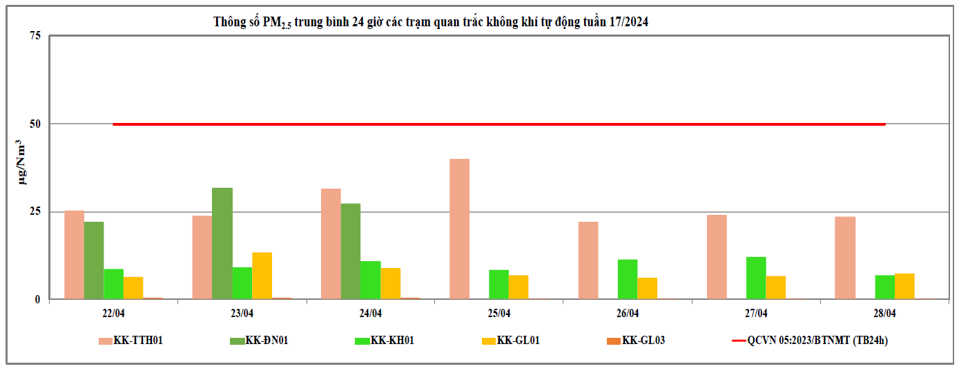 Căn cứ số liệu của 09 Trạm quan trắc tự động thuộc mạng lưới quan trắc môi trường quốc gia và địa phương tại khu vực miền Trung và Tây Nguyên do Trung tâm Quan trắc môi trường miền Trung và Tây Nguyên thực hiện từ ngày 22/04/2024 đến ngày 28/04/2024 (trong đó, 03 Trạm do Cục Kiểm soát ô nhiễm môi trường quản lý: Trạm 83 Hùng Vương - Thừa Thiên Huế (KK-TTH01), Trạm 41 Lê Duẩn - Đà Nẵng (KK-ĐN01), Trạm Vĩnh Hoà - Khánh Hoà (KK-KH01); 02 Trạm do Tổng cục Khí tượng thuỷ văn quản lý: Trạm Hoà Thuận Tây - Đà Nẵng (KK-ĐN02), Trạm Phù Đổng - Gia Lai (KK-GL04) quan trắc thông số bụi PM và 04 Trạm do địa phương quản lý: Trạm TTQT TN&MT - Tp. Pleiku (KK-GL01); Trạm UBND Thị Xã An Khê (KK-GL02); Trạm BQL KCN Trà Đa (KKGL03); Trạm Chư Sê (KK-GL5) thuộc tỉnh Gia Lai cho thấy chất lượng môi trường không khí tại khu vực miền Trung và Tây Nguyên tại các Trạm quan trắc thuộc khu vực miền Trung và Tây Nguyên dao động ở mức trung bình đến tốt (Tại thời điểm ngày 29/04, có 04/09 trạm có số liệu nhận được trên 80% theo quy định, cụ thể: Trạm 83 Hùng Vương - Thừa Thiên Huế (KK-TTH01), Trạm Vĩnh Hoà - Khánh Hoà (KK-KH01), Trạm TTQT TN&MT - Tp. Pleiku (KK-GL01) và Trạm BQL KCN Trà Đa (KK-GL03). Số liệu của Trạm 41 Lê Duẩn - Đà Nẵng (KK-ĐN01) tỉ lệ dữ liệu nhận được khoảng 38,23%. Các thông số đặc trưng trong môi trường không khí xung quanh như: NO2, CO và SO2 trong tuần nhỏ hơn giới hạn cho phép theo QCVN 05:2023/BTNMT (TB 24h)). Kết quả cụ thể chất lượng không khí tuần 17 năm 2024 thể hiện tại Biểu đồ 1 dưới đây.