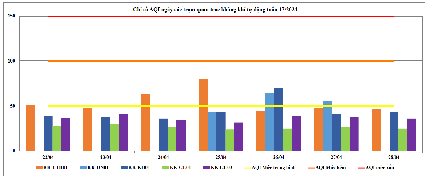 Kết quả cụ thể tại các trạm quan trắc: Trạm TTQT TN&MT - Tp. Pleiku (KK-GL01) và BQL KCN Trà Đa (KK-GL03) có chất lượng môi trường không khí dao động ở mức tốt, cụ thể: từ ngày 22/04 đến ngày 28/04 ghi nhận mức tốt (VN_AQI: 0 - 50) chiếm tỉ lệ 100%. Trạm 83 Hùng Vương - Thừa Thiên Huế (KK-TTH01) có chất lượng môi trường không khí dao động ở mức trung bình đến tốt, cụ thể: Ngày 22/04, ngày 24/04 đến ngày 25/04 ghi nhận mức trung bình (VN_AQI: 51 - 100) chiếm tỉ lệ 42,9%. Từ ngày 23/04, ngày 26/04 đến ngày 28/04 ghi nhận mức tốt (VN_AQI: 0 - 50) chiếm tỉ lệ 57,1%. Trạm Vĩnh Hoà - Khánh Hoà (KK-KH01) có chất lượng môi trường không khí dao động ở mức trung bình đến tốt, cụ thể: từ ngày 22/04 đến ngày 25/04, ngày 27/04 đến ngày 28/04 ghi nhận mức tốt (VN_AQI: 0 - 50) chiếm tỉ lệ 85,7%, ngày 26/04 ghi nhận mức trung bình (VN_AQI: 51 - 100) chiếm tỉ lệ 14,3%. Trạm 41 Lê Duẩn - Đà Nẵng (KK-ĐN01) có chất lượng môi trường không khí dao động ở mức trung bình đến tốt, cụ thể: ngày 25/04 ghi nhận mức tốt (VN_AQI: 0 - 50) chiếm tỉ lệ 33,3%, ngày 26/04 đến ngày 27/04 ghi nhận mức trung bình (VN_AQI: 51 - 100) chiếm tỉ lệ 66,7%, từ ngày 22/04 đến ngày 24/04 và ngày 28/04 bị mất kết nối. Chỉ số VN_AQI ngày tại một số Trạm khu vực miền Trung và Tây Nguyên chi tiết thể hiện tại Bảng 1.