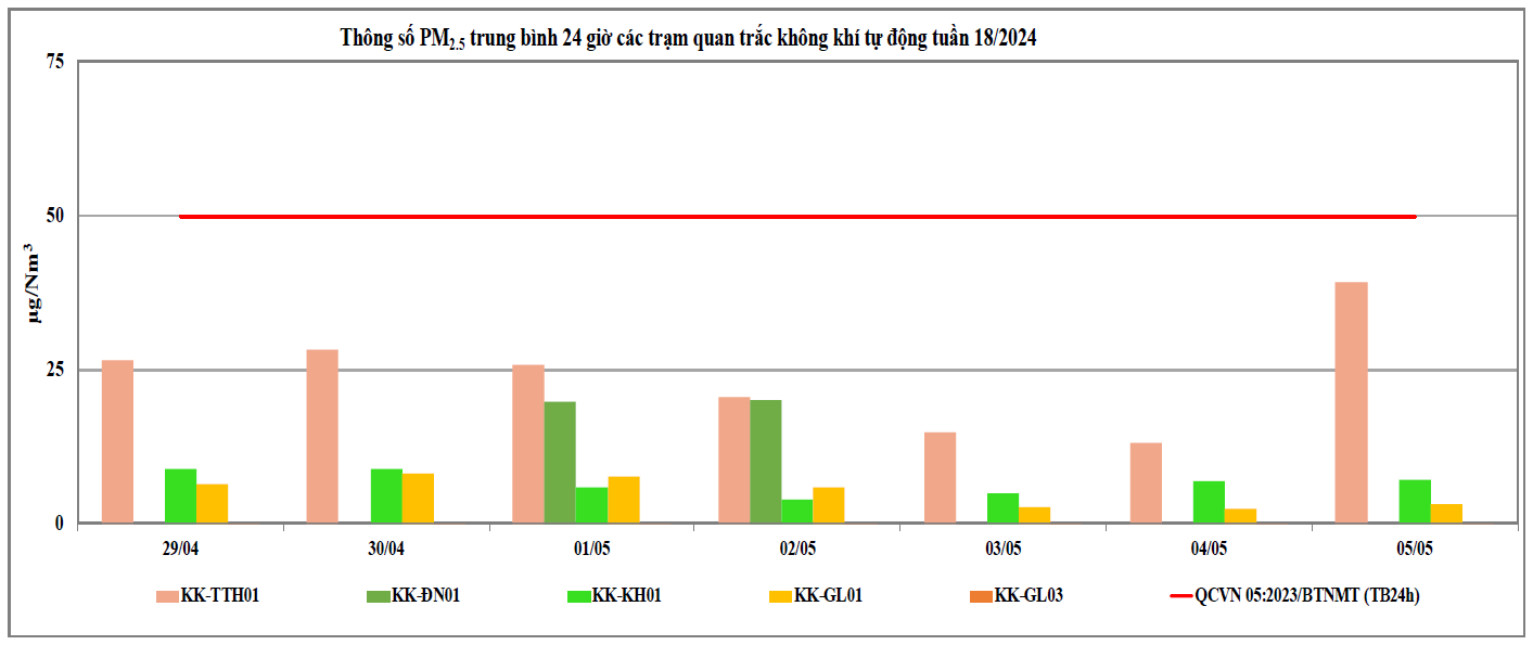 Căn cứ số liệu của 09 Trạm quan trắc tự động thuộc mạng lưới quan trắc môi trường quốc gia và địa phương tại khu vực miền Trung và Tây Nguyên do Trung tâm Quan trắc môi trường miền Trung và Tây Nguyên thực hiện từ ngày 29/04/2024 đến ngày 05/05/2024 (trong đó, 03 Trạm do Cục Kiểm soát ô nhiễm môi trường quản lý: Trạm 83 Hùng Vương - Thừa Thiên Huế (KK-TTH01), Trạm 41 Lê Duẩn - Đà Nẵng (KK-ĐN01), Trạm Vĩnh Hoà - Khánh Hoà (KK-KH01); 02 Trạm do Tổng cục Khí tượng thuỷ văn quản lý: Trạm Hoà Thuận Tây - Đà Nẵng (KK-ĐN02), Trạm Phù Đổng - Gia Lai (KK-GL04) quan trắc thông số bụi PM và 04 Trạm do địa phương quản lý: Trạm TTQT TN&MT - Tp. Pleiku (KK-GL01); Trạm UBND Thị Xã An Khê (KK-GL02); Trạm BQL KCN Trà Đa (KKGL03); Trạm Chư Sê (KK-GL5) thuộc tỉnh Gia Lai cho thấy chất lượng môi trường không khí tại khu vực miền Trung và Tây Nguyên tại các Trạm quan trắc thuộc khu vực miền Trung và Tây Nguyên dao động ở mức trung bình đến tốt (Tại thời điểm ngày 06/05, có 04/09 trạm có số liệu nhận được trên 80% theo quy định, cụ thể: Trạm 83 Hùng Vương - Thừa Thiên Huế (KK-TTH01), Trạm Vĩnh Hoà - Khánh Hoà (KK-KH01), Trạm TTQT TN&MT - Tp. Pleiku (KK-GL01) và Trạm BQL KCN Trà Đa (KK-GL03). Số liệu của Trạm 41 Lê Duẩn - Đà Nẵng (KK-ĐN01) tỉ lệ dữ liệu nhận được khoảng 20,26%. Các thông số đặc trưng trong môi trường không khí xung quanh như: NO2, CO và SO2 trong tuần nhỏ hơn giới hạn cho phép theo QCVN 05:2023/BTNMT (TB 24h)). Kết quả cụ thể chất lượng không khí tuần 18 năm 2024 thể hiện tại Biểu đồ 1 dưới đây.
