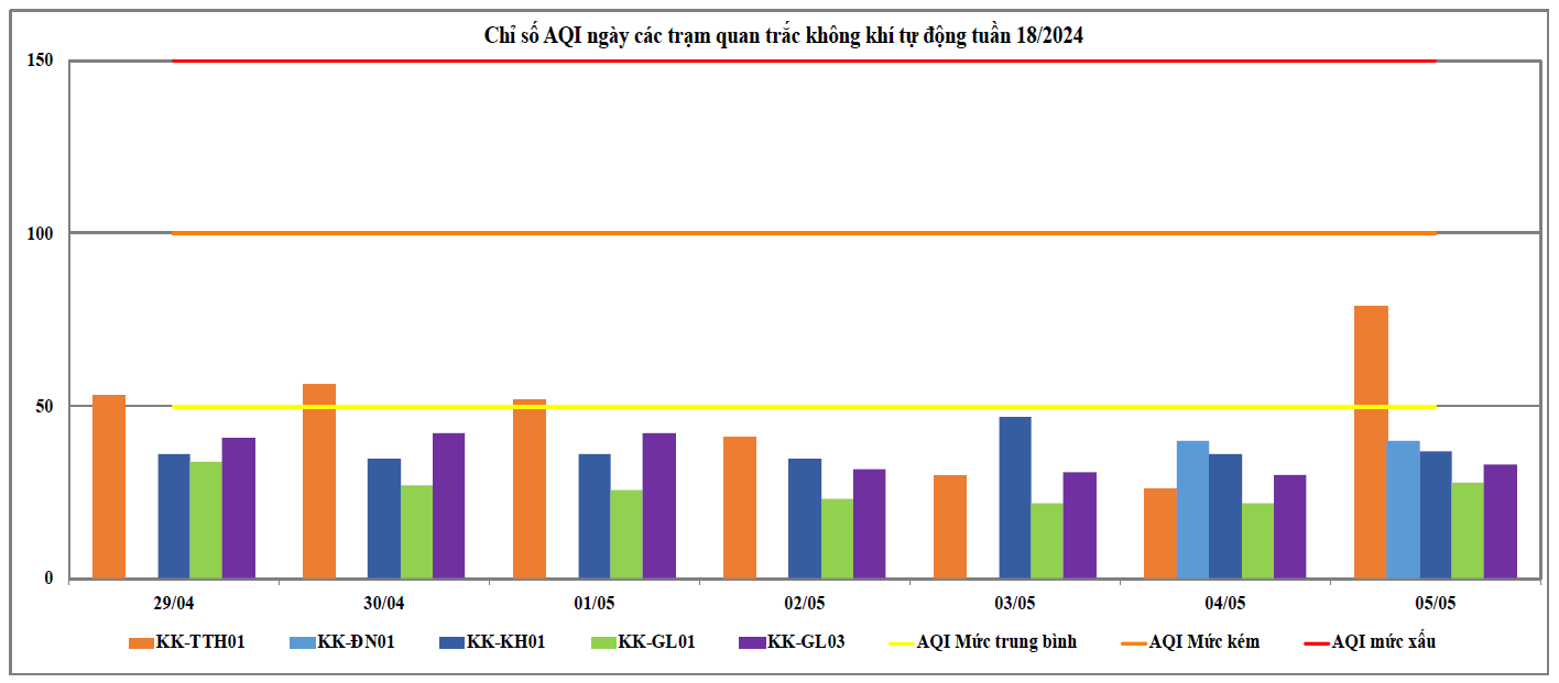 Kết quả cụ thể tại các trạm quan trắc: Trạm 83 Hùng Vương - Thừa Thiên Huế (KK-TTH01), Trạm TTQT TN&MT - Tp. Pleiku (KK-GL01) và BQL KCN Trà Đa (KK-GL03) có chất lượng môi trường không khí dao động ở mức tốt, cụ thể: Ngày 29/04 đến ngày 05/05 ghi nhận mức tốt (VN_AQI: 0 - 50) chiếm tỉ lệ 100%. Trạm Vĩnh Hoà - Khánh Hoà (KK-KH01) có chất lượng môi trường không khí dao động ở mức trung bình đến tốt, cụ thể: từ ngày 29/04 đến ngày 01/05, ngày 05/05 ghi nhận mức trung bình (VN_AQI: 51 - 100) chiếm tỉ lệ 57,1%, từ ngày 02/05 đến ngày 04/05 ghi nhận mức tốt (VN_AQI: 0 - 50) chiếm tỉ lệ 42,9%; Trạm 41 Lê Duẩn - Đà Nẵng (KK-ĐN01) có chất lượng môi trường không khí dao động ở mức tốt, cụ thể: ngày 04/05 đến ngày 05/05 ghi nhận mức tốt (VN_AQI: 0 - 50) chiếm tỉ lệ 100%, từ ngày 29/04 đến ngày 03/05 bị mất kết nối. Chỉ số VN_AQI ngày tại một số Trạm khu vực miền Trung và Tây Nguyên chi tiết thể hiện tại Bảng 1.