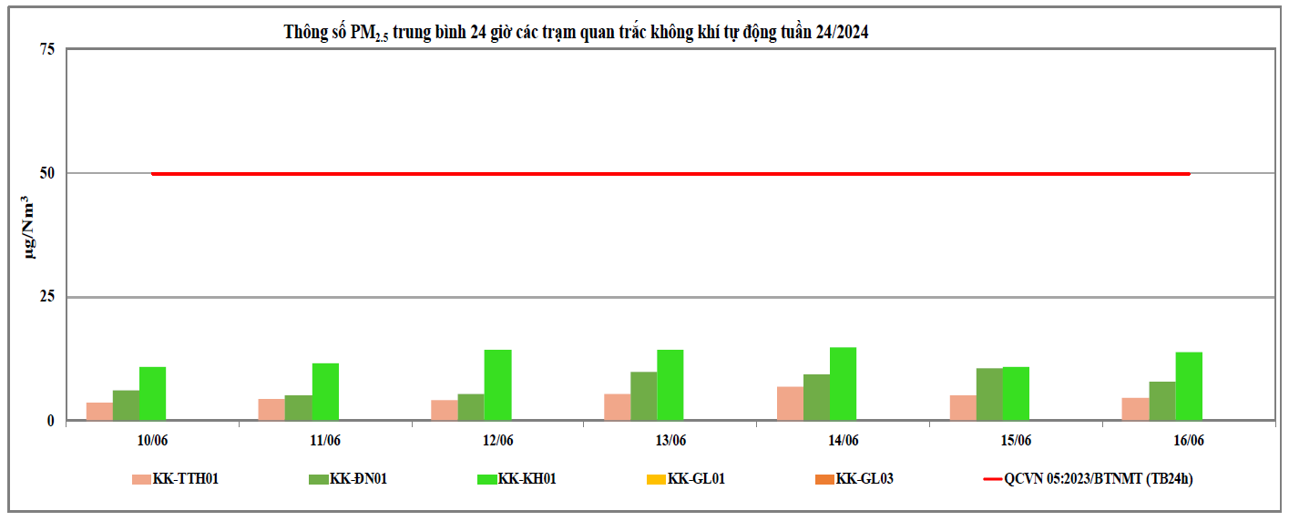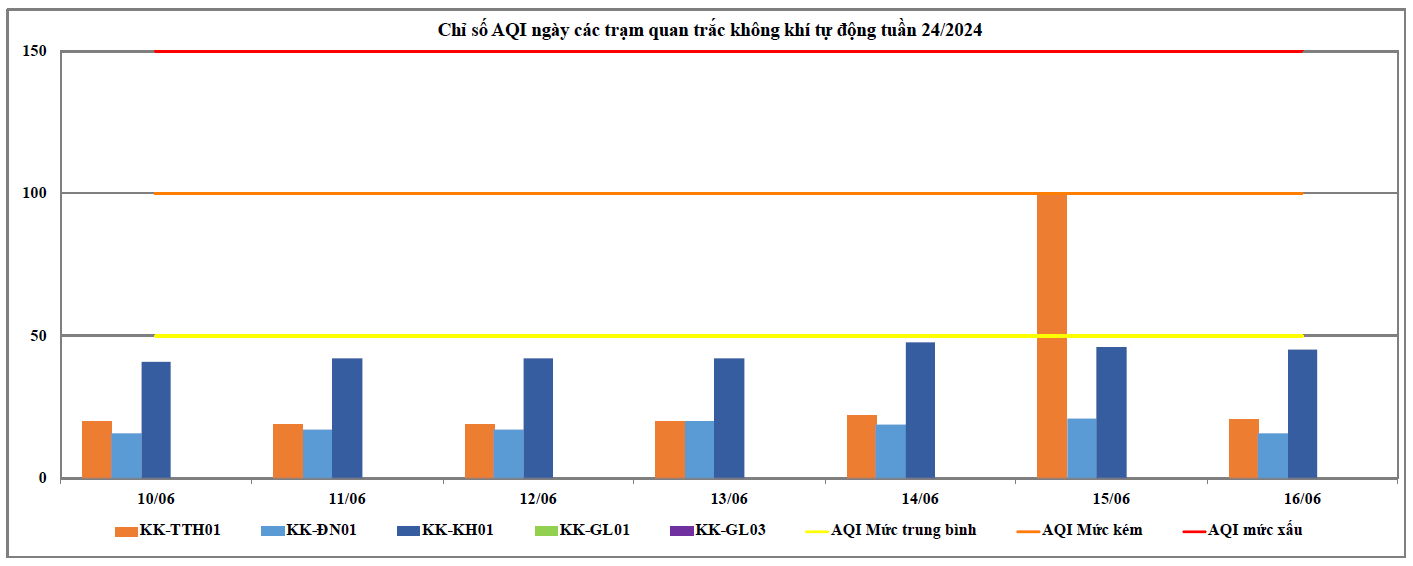 Căn cứ số liệu của 09 Trạm quan trắc tự động thuộc mạng lưới quan trắc môi trường quốc gia và địa phương tại khu vực miền Trung và Tây Nguyên do Trung tâm Quan trắc môi trường miền Trung và Tây Nguyên thực hiện từ ngày 10/6/2024 đến ngày 16/6/2024 (trong đó, 03 Trạm do Cục Kiểm soát ô nhiễm môi trường quản lý: Trạm 83 Hùng Vương - Thừa Thiên Huế (KK-TTH01), Trạm 41 Lê Duẩn - Đà Nẵng (KK-ĐN01), Trạm Vĩnh Hoà - Khánh Hoà (KK-KH01); 02 Trạm do Tổng cục Khí tượng thuỷ văn quản lý: Trạm Hoà Thuận Tây - Đà Nẵng (KK-ĐN02), Trạm Phù Đổng - Gia Lai (KK-GL04) quan trắc thông số bụi PM và 04 Trạm do địa phương quản lý: Trạm TTQT TN&MT - Tp. Pleiku (KK-GL01); Trạm UBND Thị Xã An Khê (KK-GL02); Trạm BQL KCN Trà Đa (KKGL03); Trạm Chư Sê (KK-GL5) thuộc tỉnh Gia Lai) cho thấy chất lượng môi trường không khí tại khu vực miền Trung và Tây Nguyên tại các Trạm quan trắc thuộc khu vực miền Trung và Tây Nguyên dao động ở mức trung bình đến tốt (Tại thời điểm ngày 17/6/2024, có 03/09 trạm có số liệu nhận được trên 80% theo quy định, cụ thể: Trạm 83 Hùng Vương - Thừa Thiên Huế (KK-TTH01), Trạm Vĩnh Hoà - Khánh Hoà (KK-KH01), và Trạm 41 Lê Duẩn - Đà Nẵng (KK-ĐN01). Các thông số đặc trưng trong môi trường không khí xung quanh như: NO2, CO và SO2 trong tuần nhỏ hơn giới hạn cho phép theo QCVN 05:2023/BTNMT (TB 24h). Kết quả cụ thể chất lượng không khí tuần 24 năm 2024 thể hiện tại Biểu đồ 1 dưới đây.