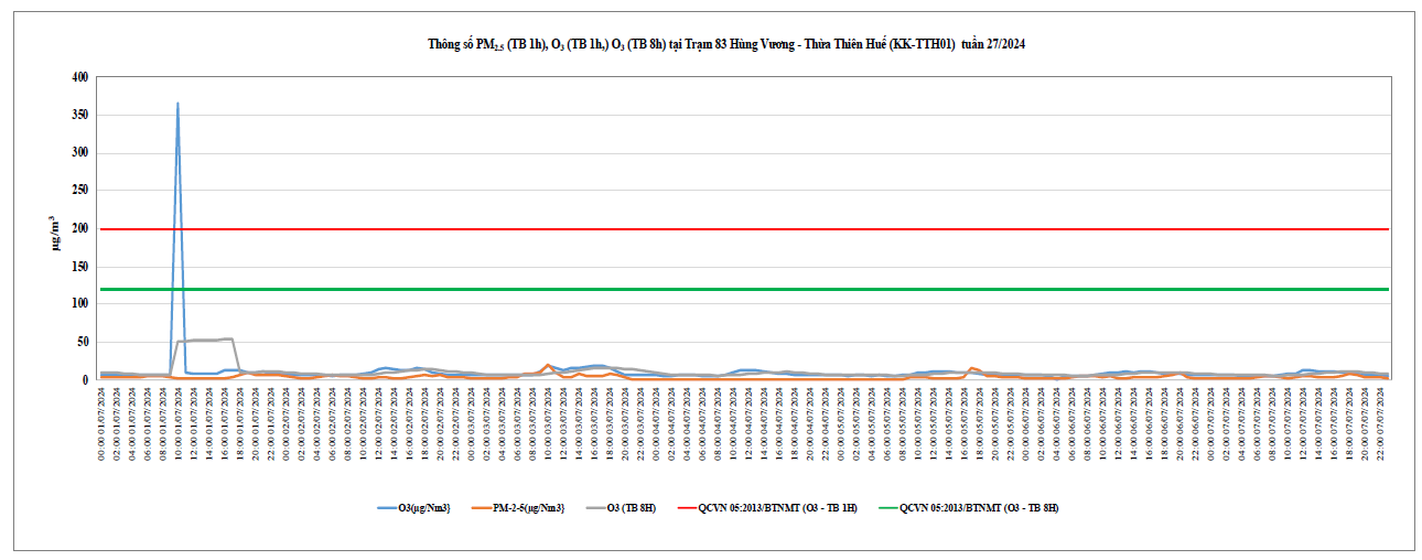 Biểu đồ 2. Diễn biến giá trị PM2.5 (TB 1h), O3 (TB 1h), O3 (TB 8h) tại Trạm 83 Hùng Vương - Thừa Thiên Huế
