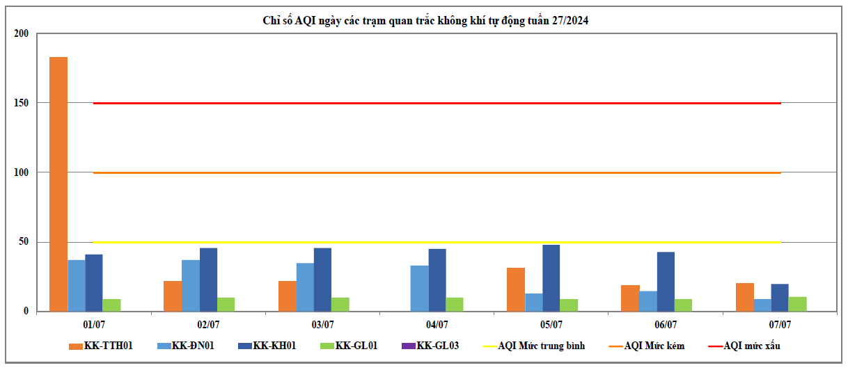 Kết quả cụ thể tại các trạm quan trắc: Trạm 83 Hùng Vương - Thừa Thiên Huế (KK-TTH01) có chất lượng môi trường không khí dao động từ mức xấu đến mức tốt, cụ thể: Ngày 01/07 ghi nhận mức xấu (VN_AQI: 151 - 200) chiếm tỉ lệ 16,7%. Từ ngày 02/07 đến ngày 07/07 ghi nhận mức tốt (VN_AQI: 0 - 50) chiếm tỉ lệ 83,3%. Trạm Vĩnh Hoà - Khánh Hoà (KK-KH01), Trạm 41 Lê Duẩn - Đà Nẵng (KK-ĐN01) và Trạm TTQT TN&MT - Tp. Pleiku (KK-GL01) có chất lượng môi trường không khí dao động ở mức tốt, cụ thể: Từ ngày 01/07 đến ngày 07/07 ghi nhận mức tốt (VN_AQI: 0 - 50) chiếm tỉ lệ 100%. Chỉ số VN_AQI ngày tại một số Trạm khu vực miền Trung và Tây Nguyên chi tiết thể hiện tại Bảng 1.