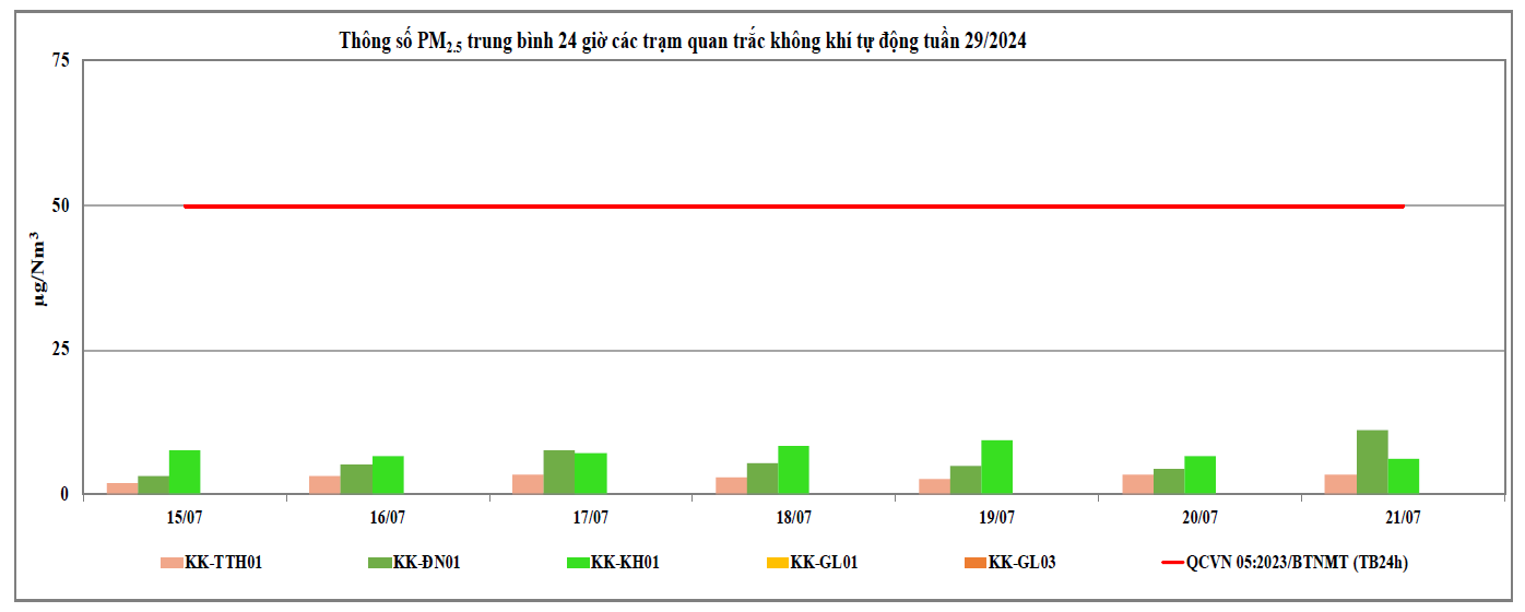 Căn cứ số liệu của 09 Trạm quan trắc tự động thuộc mạng lưới quan trắc môi trường quốc gia và địa phương tại khu vực miền Trung và Tây Nguyên do Trung tâm Quan trắc môi trường miền Trung và Tây Nguyên thực hiện từ ngày 15/7/2024 đến ngày 21/7/2024 (trong đó, 03 Trạm do Cục Kiểm soát ô nhiễm môi trường quản lý: Trạm 83 Hùng Vương - Thừa Thiên Huế (KK-TTH01), Trạm 41 Lê Duẩn - Đà Nẵng (KK-ĐN01), Trạm Vĩnh Hoà - Khánh Hoà (KK-KH01); 02 Trạm do Tổng cục Khí tượng thuỷ văn quản lý: Trạm Hoà Thuận Tây - Đà Nẵng (KK-ĐN02), Trạm Phù Đổng - Gia Lai (KK-GL04) quan trắc thông số bụi PM và 04 Trạm do địa phương quản lý: Trạm TTQT TN&MT - Tp. Pleiku (KK-GL01); Trạm UBND Thị Xã An Khê (KK-GL02); Trạm BQL KCN Trà Đa (KKGL03); Trạm Chư Sê (KK-GL5) thuộc tỉnh Gia Lai) cho thấy chất lượng môi trường không khí tại khu vực miền Trung và Tây Nguyên tại các Trạm quan trắc thuộc khu vực miền Trung và Tây Nguyên dao động ở mức xấu đến tốt (Tại thời điểm ngày 22/7, có 04/09 trạm có số liệu nhận được trên 80% theo quy định, cụ thể: Trạm 83 Hùng Vương - Thừa Thiên Huế (KK-TTH01), Trạm Vĩnh Hoà - Khánh Hoà (KK-KH01), Trạm 41 Lê Duẩn - Đà Nẵng (KK-ĐN01) và Trạm BQL KCN Trà Đa (KK-GL03), các số liệu này sẽ được sử dụng để đánh giá chất lượng môi trường không khí xung quanh. Các thông số đặc trưng trong môi trường không khí xung quanh như: NO2, CO và SO2 trong tuần nhỏ hơn giới hạn cho phép theo QCVN 05:2023/BTNMT (TB 24h). Kết quả cụ thể chất lượng không khí tuần 29 năm 2024 thể hiện tại Biểu đồ 1 và 2 dưới đây.