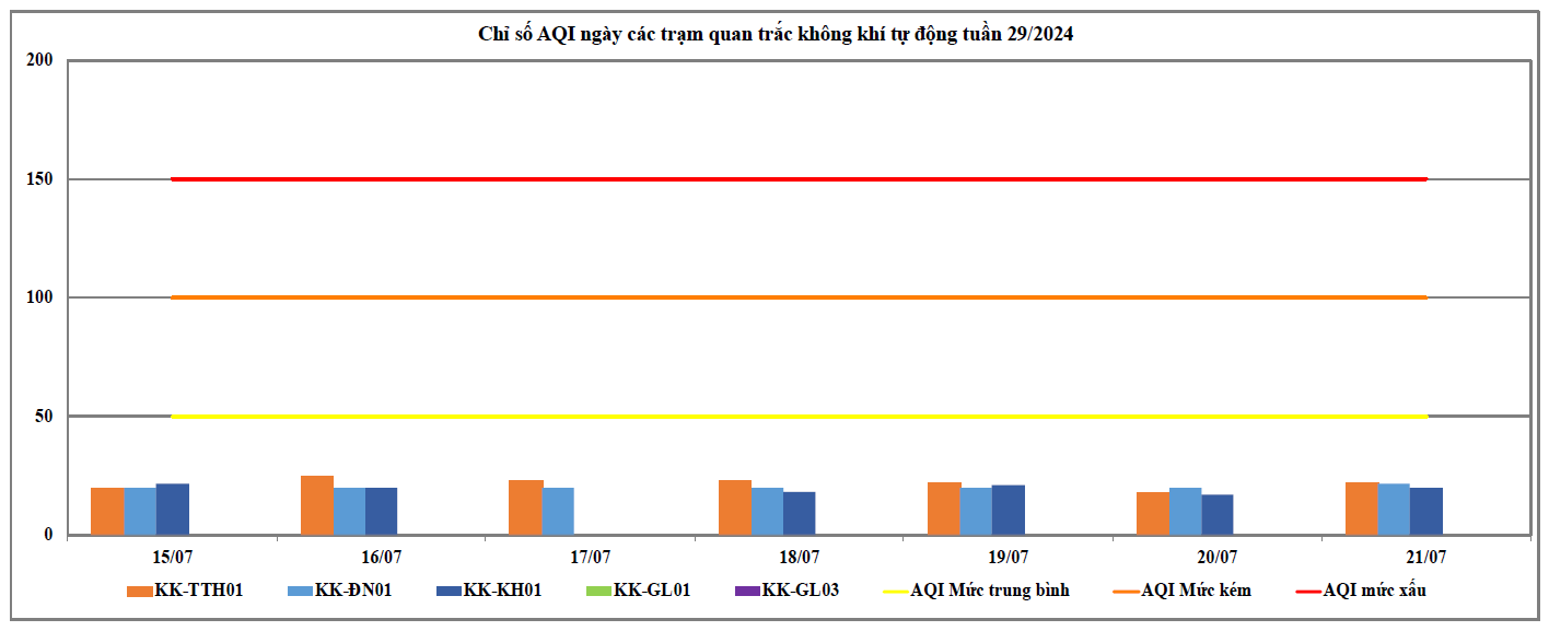 Theo kết quả tính toán chỉ số VN_AQI tuần 29 (từ ngày 15/7/2024 đến ngày 21/7/2024), các Trạm quan trắc thuộc khu vực miền Trung và Tây Nguyên có chất lượng không khí xung quanh dao động ở mức tốt. Kết quả cụ thể tại các trạm quan trắc: Trạm 83 Hùng Vương - Thừa Thiên Huế (KK-TTH01) và Trạm 41 Lê Duẩn - Đà Nẵng (KK-ĐN01) có chất lượng môi trường không khí dao động ở mức tốt, cụ thể: Từ ngày 15/07 đến ngày 21/07 ghi nhận mức tốt (VN_AQI: 0 - 50) chiếm tỉ lệ 100%, Trạm Vĩnh Hoà - Khánh Hoà (KK-KH01) có chất lượng môi trường không khí dao động ở mức tốt, cụ thể: Từ ngày 15/07, 16/07, ngày 18/07 đến ngày 21/07 ghi nhận mức tốt (VN_AQI: 0 - 50) chiếm tỉ lệ 100%.. Chỉ số VN_AQI ngày tại một số Trạm khu vực miền Trung và Tây Nguyên chi tiết thể hiện tại Bảng 1.