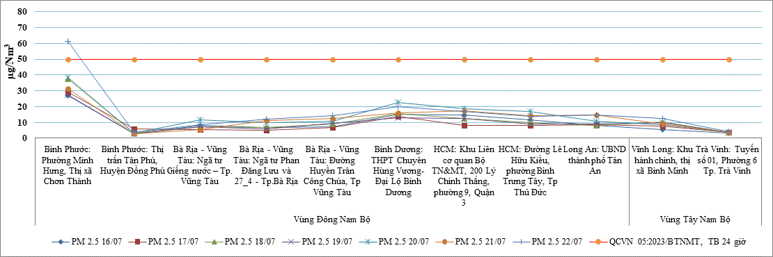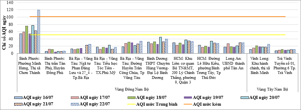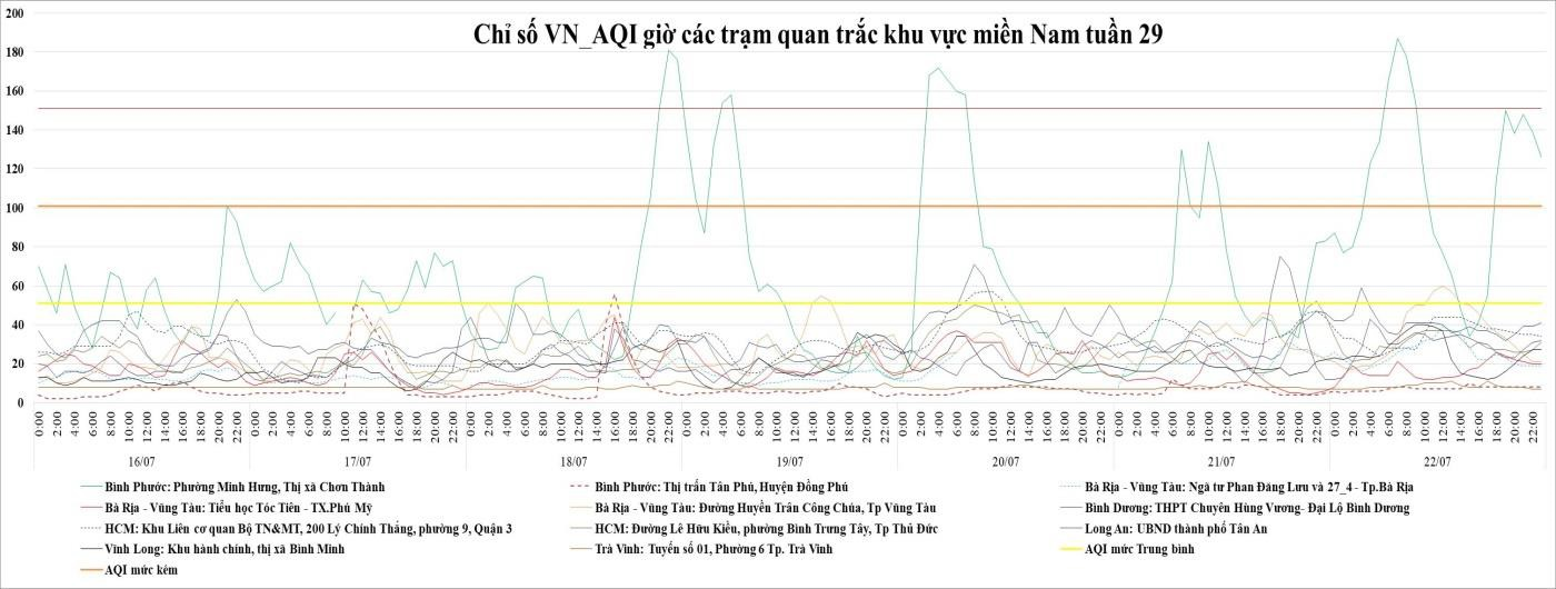 Căn cứ số liệu của 27 trạm quan trắc tự động (QTTĐ) không khí xung quanh, gồm: 07 trạm cố định của quốc gia và 20 trạm cố định của địa phương được sử dụng để tính toán AQI và công bố chất lượng không khí vùng (tổng số 30 trạm, quốc gia có 08 trạm trong đó có 01 trạm cảm biến; địa phương có 22 trạm trong đó có 01 trạm không đủ điều kiện tính AQI, 01 trạm tạm ngưng hoạt động) cho thấy chất lượng môi trường không khí tại khu vực miền Nam tại các Trạm quan trắc thuộc khu vực miền Nam dao động ở mức từ trung bình đến tốt (Trong khoảng thời gian tuần 29 năm 2024 (từ ngày 16/7/2024 đến ngày 22/7/2024). Trong khoảng thời gian tuần 29 năm 2024, 15/27 trạm có dữ liệu không phù hợp công bố thông tin, 16/27 trạm có dữ liệu không phù hợp công bố thông tin, 11/27 trạm có số liệu đảm bảo chất lượng để tính toán AQI và công bố chất lượng môi trường không khí (trong 11 trạm có 05 trạm quốc gia, 06 trạm địa phương) của các tỉnh: Bà Rịa – Vũng Tàu, Bình Phước, Bình Dương, Long An, Tp. Hồ Chí Minh, Vĩnh Long, và Trà Vinh. Giá trị trung bình 24 giờ thông số PM2.5 trạm thị xã Chơn Thành, tỉnh Bình Phước có 01 lần vượt giới hạn quy định của QCVN 05:2023/BTNMT. Giá trị trung bình 01 giờ, trung bình 08 giờ, trung bình 24 giờ của các thông số PM10, PM2.5, NO2, O3, CO và SO2 (các thông số dùng tính toán AQI) tại các trạm còn lại về cơ bản vẫn nằm trong giới hạn quy định của QCVN 05:2023/BTNMT. Kết quả cụ thể chất lượng không khí tuần 29 năm 2024 thể hiện tại Biểu đồ 1 và Bảng 1 dưới đây.
