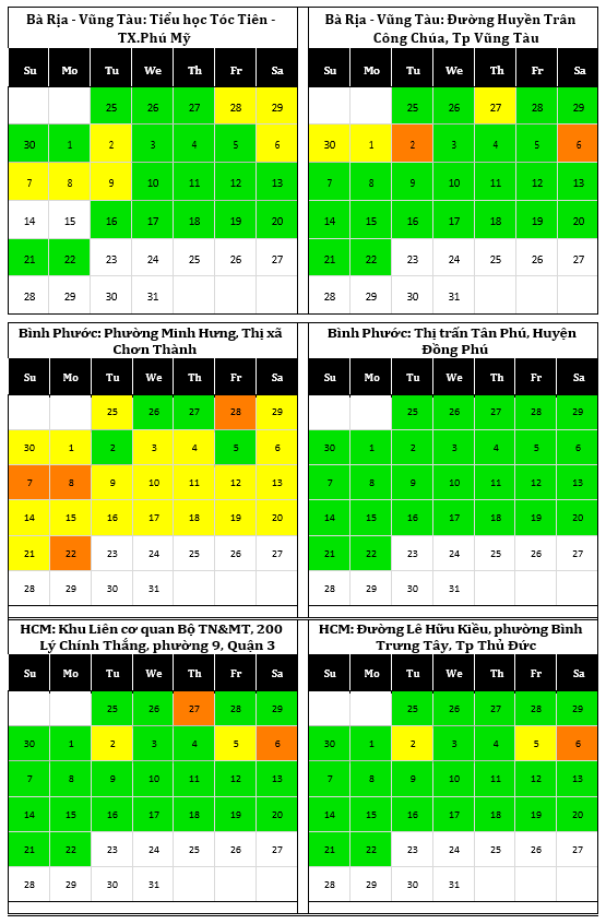 Theo kết quả quan trắc tại các trạm quan trắc tự động tuần 29 năm 2024 cho thấy chỉ số AQI ngày ở mức kém tại trạm thị xã Chơn Thành, tỉnh Bình Phước vào ngày 22/7, tại các trạm còn lại có giá trị AQI ngày ở mức trung bình và tốt. Có thể thấy mưa kéo dài trong 02 tuần qua đã góp phần cải thiện chất lượng môi trường không khí khu vực miền Nam cụ thể tại Bảng 2 và các Biểu đồ 2, 3, 4 dưới đây.