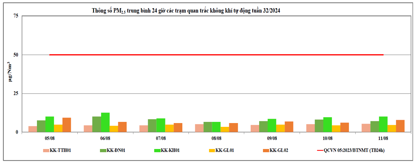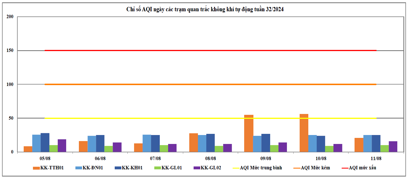 Căn cứ số liệu của 09 Trạm quan trắc tự động thuộc mạng lưới quan trắc môi trường quốc gia và địa phương tại khu vực miền Trung và Tây Nguyên do Trung tâm Quan trắc môi trường miền Trung và Tây Nguyên thực hiện từ ngày 05/8/2024 đến ngày 11/8/2024 (trong đó, 03 Trạm do Cục Kiểm soát ô nhiễm môi trường quản lý: Trạm 83 Hùng Vương - Thừa Thiên Huế (KK-TTH01), Trạm 41 Lê Duẩn - Đà Nẵng (KK-ĐN01), Trạm Vĩnh Hoà - Khánh Hoà (KK-KH01); 02 Trạm do Tổng cục Khí tượng thuỷ văn quản lý: Trạm Hoà Thuận Tây - Đà Nẵng (KK-ĐN02), Trạm Phù Đổng - Gia Lai (KK-GL04) quan trắc thông số bụi PM và 04 Trạm do địa phương quản lý: Trạm TTQT TN&MT - Tp. Pleiku (KK-GL01); Trạm UBND Thị Xã An Khê (KK-GL02); Trạm BQL KCN Trà Đa (KKGL03); Trạm Chư Sê (KK-GL5) thuộc tỉnh Gia Lai) cho thấy chất lượng môi trường không khí tại khu vực miền Trung và Tây Nguyên tại các Trạm quan trắc thuộc khu vực miền Trung và Tây Nguyên dao động ở mức xấu đến tốt (Tại thời điểm ngày 12/8 có 06/09 trạm có số liệu nhận được trên 80% theo quy định, cụ thể: Trạm Vĩnh Hoà - Khánh Hoà (KK-KH01), Trạm 41 Lê Duẩn - Đà Nẵng (KK-ĐN01), Trạm 83 Hùng Vương - Thừa Thiên Huế (KK-TTH01), Trạm BQL KCN Trà Đa (KK-GL03), Trạm TTQT TN&MT - Tp. Pleiku (KK-GL01) và Trạm UBND Thị Xã An Khê (KK-GL02). Tuy nhiên, qua phần mềm Envisoft không nhận được dữ liệu thông số PM2.5 của Trạm BQL KCN Trà Đa (KK-GL03) do đó không đánh giá được chỉ số AQI. Các thông số đặc trưng trong môi trường không khí xung quanh như: NO2, CO và SO2 trong tuần nhỏ hơn giới hạn cho phép theo QCVN 05:2023/BTNMT (TB 24h). Kết quả cụ thể chất lượng không khí tuần 32 năm 2024 thể hiện tại Biểu đồ 1 và 2 dưới đây.