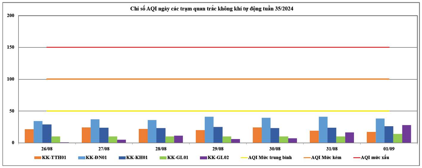 Căn cứ số liệu của 09 Trạm quan trắc tự động thuộc mạng lưới quan trắc môi trường quốc gia và địa phương tại khu vực miền Trung và Tây Nguyên do Trung tâm Quan trắc môi trường miền Trung và Tây Nguyên thực hiện từ ngày 26/8/2024 đến ngày 01/9/2024 (trong đó, 03 Trạm do Cục Kiểm soát ô nhiễm môi trường quản lý: Trạm 83 Hùng Vương - Thừa Thiên Huế (KK-TTH01), Trạm 41 Lê Duẩn - Đà Nẵng (KK-ĐN01), Trạm Vĩnh Hoà - Khánh Hoà (KK-KH01); 02 Trạm do Tổng cục Khí tượng thuỷ văn quản lý: Trạm Hoà Thuận Tây - Đà Nẵng (KK-ĐN02), Trạm Phù Đổng - Gia Lai (KK-GL04) quan trắc thông số bụi PM và 04 Trạm do địa phương quản lý: Trạm TTQT TN&MT - Tp. Pleiku (KK-GL01); Trạm UBND Thị Xã An Khê (KK-GL02); Trạm BQL KCN Trà Đa (KKGL03); Trạm Chư Sê (KK-GL5) thuộc tỉnh Gia Lai) cho thấy chất lượng môi trường không khí tại khu vực miền Trung và Tây Nguyên tại các Trạm quan trắc thuộc khu vực miền Trung và Tây Nguyên dao động ở mức xấu đến tốt (Tại thời điểm ngày 03/9 có 06/09 trạm có số liệu nhận được trên 80% theo quy định, cụ thể: Trạm Vĩnh Hoà - Khánh Hoà (KK-KH01), Trạm 41 Lê Duẩn - Đà Nẵng (KK-ĐN01), Trạm 83 Hùng Vương - Thừa Thiên Huế (KK-TTH01), Trạm BQL KCN Trà Đa (KK-GL03), Trạm TTQT TN&MT - Tp. Pleiku (KK-GL01) và Trạm UBND Thị Xã An Khê (KK-GL02). Tuy nhiên, qua phần mềm Envisoft không nhận được dữ liệu thông số PM2.5 của Trạm BQL KCN Trà Đa (KK-GL03) do đó không đánh giá được chỉ số AQI. Các thông số đặc trưng trong môi trường không khí xung quanh như: NO2, CO và SO2 trong tuần nhỏ hơn giới hạn cho phép theo QCVN 05:2023/BTNMT (TB 24h). Kết quả cụ thể chất lượng không khí tuần 35 năm 2024 thể hiện tại Biểu đồ 1 và 2 dưới đây.