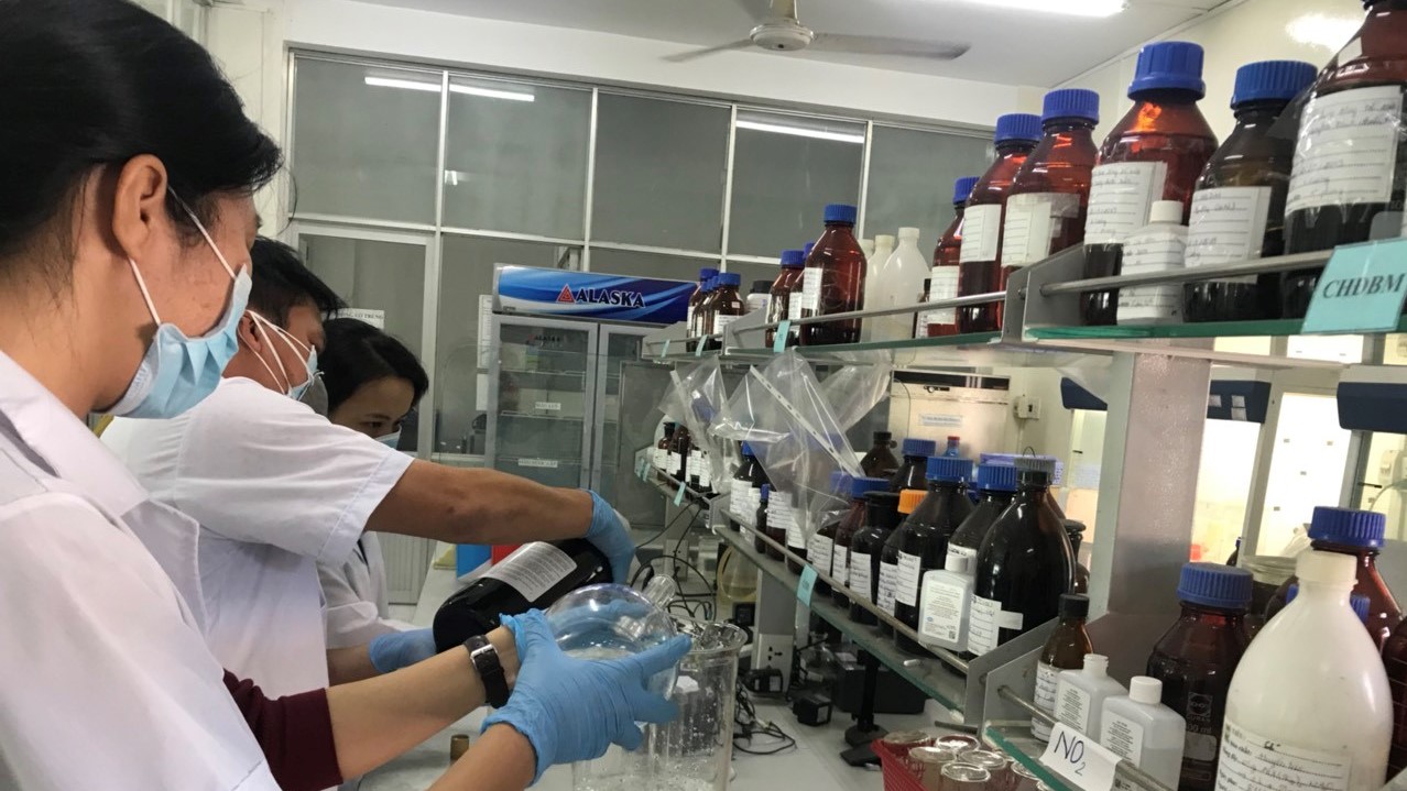 Nhân viên phòng thử nghiệm của BREM đang pha chế dung dịch nước rửa tay khô
