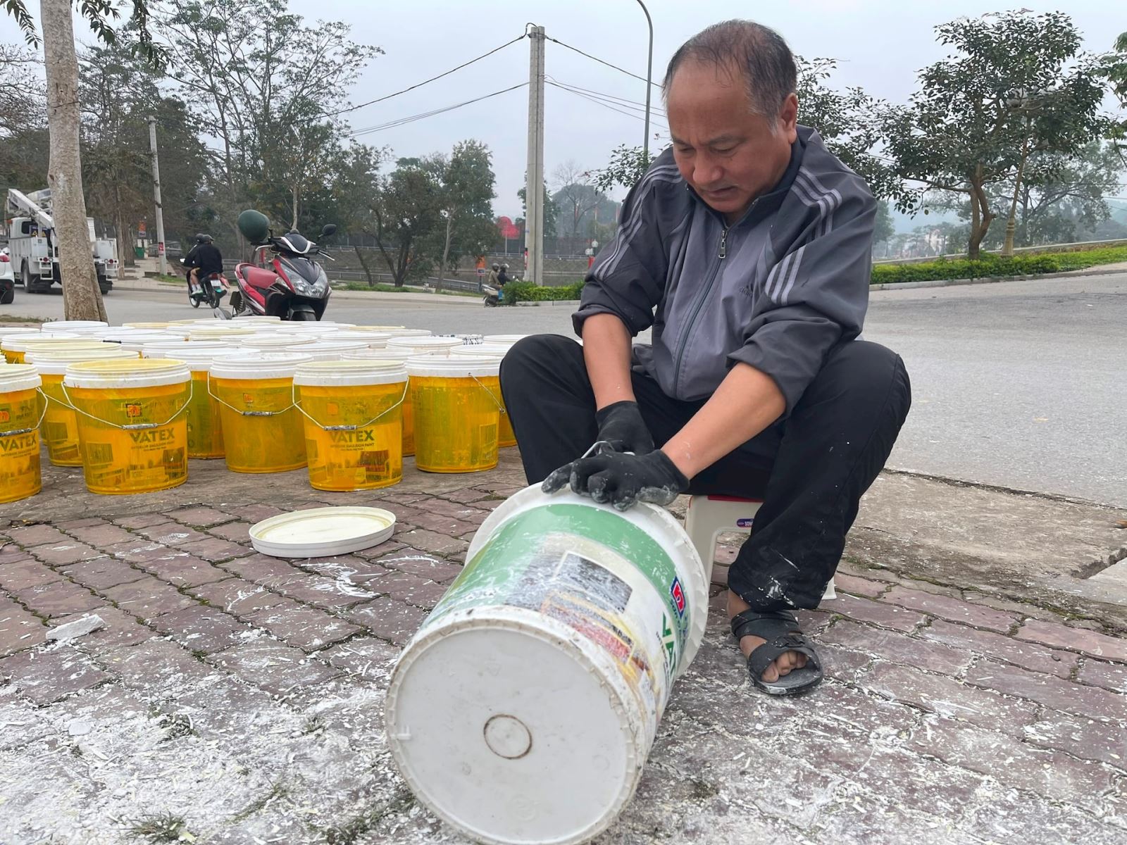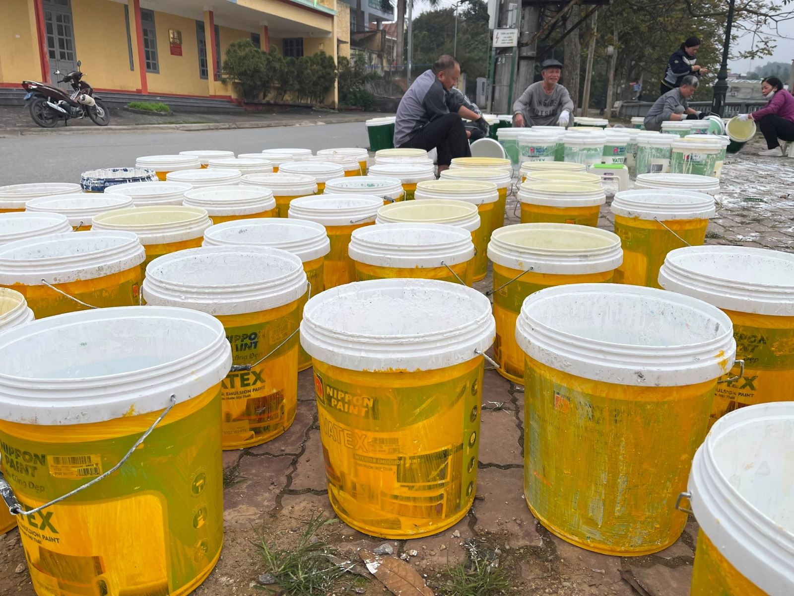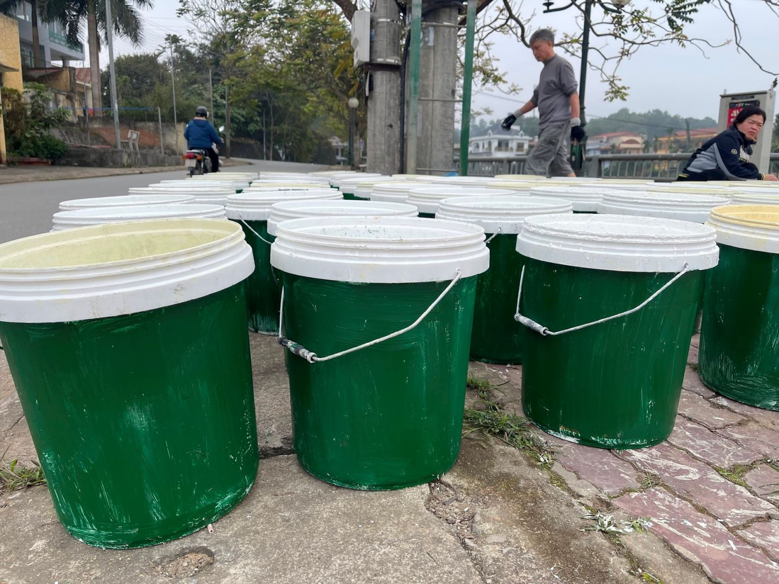 Các thùng sơn được sơn 2 màu vàng và xanh để phân biệt.