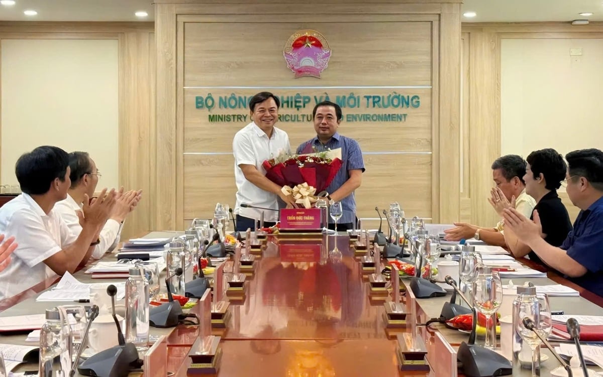 Thứ trưởng Nguyễn Hoàng Hiệp, Phó Bí thư thường trực Đảng ủy Bộ Nông nghiệp và Môi trường tặng hoa chúc mừng đồng chí Trần Đức Thắng, Quyền Bộ trưởng Bộ Nông nghiệp và Môi trường giữ chức Bí thư Đảng ủy Bộ Nông nghiệp và Môi trường nhiệm kỳ 2020-2025.