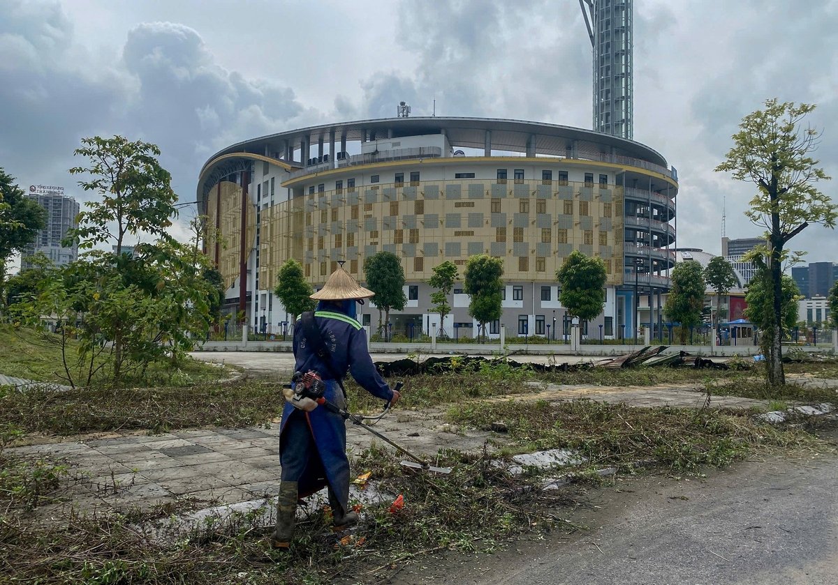 Các công nhân vệ sinh môi trường đang dọn dẹp để chào mừng đại lễ 80 năm Quốc khánh 2/9.