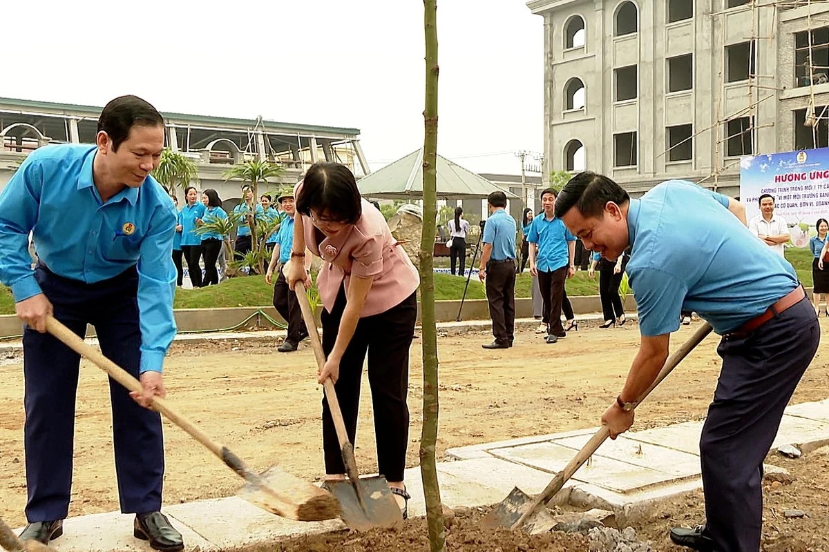 Liên đoàn Lao động trồng cây tại khuôn viên trường Trung cấp Kỹ thuật du lịch Công đoàn Ninh Bình. .