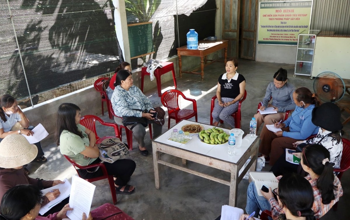 Các học viên tham quan, học tập các mô hình tại thực địa. Ảnh: Văn Dinh. Người nông dân chia sẻ về mô hình chuối sấy + điểm thu mua nông sản VietGAP.