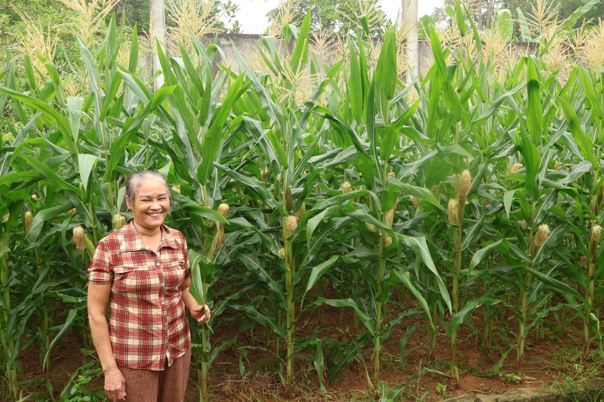 Bà Nguyễn Thị Tính bên vườn ngô bón than sinh học kết hợp phân chuồng và NPK.