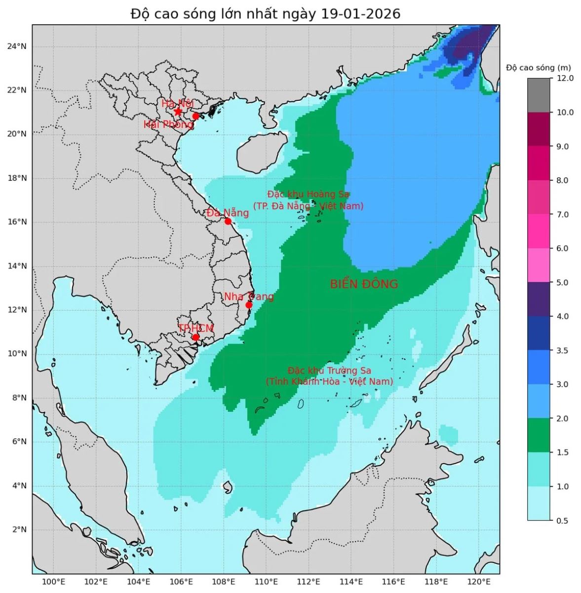 Dự báo độ cao sóng lớn nhất ngày 19/1. Ảnh: Trung tâm Dự báo khí tượng thủy văn quốc gia.