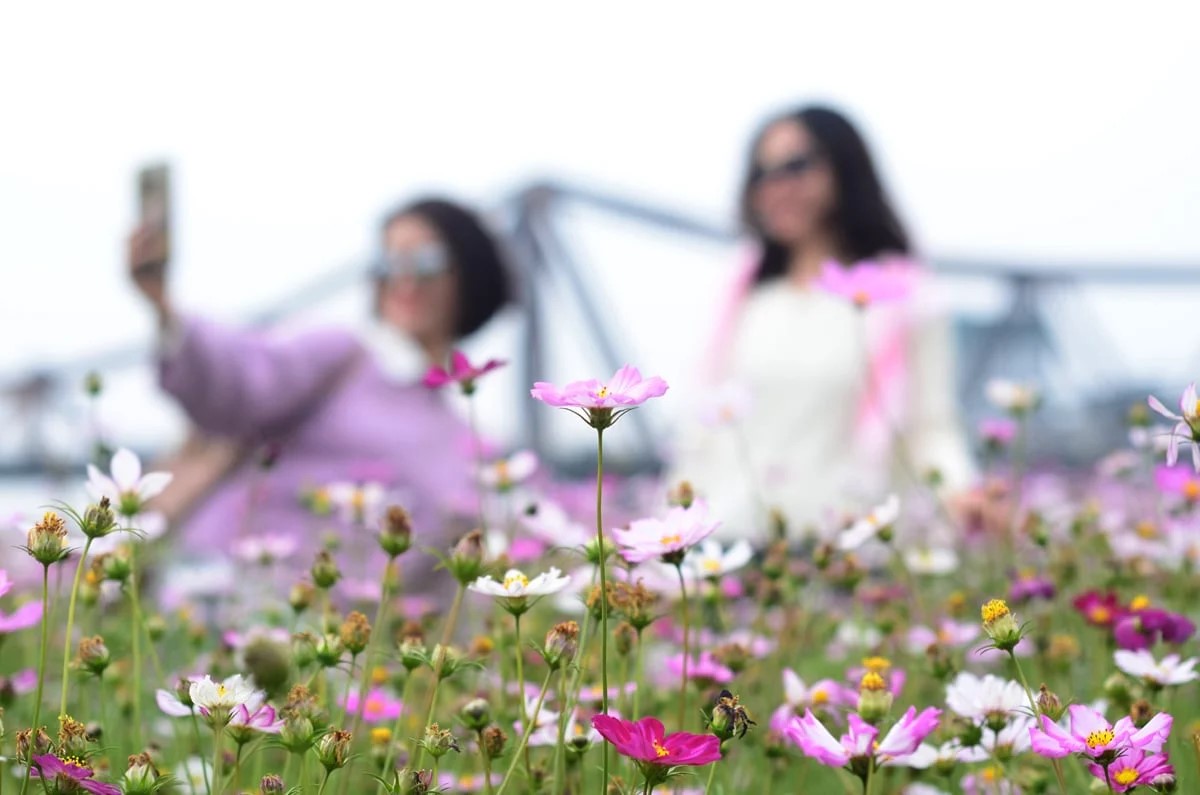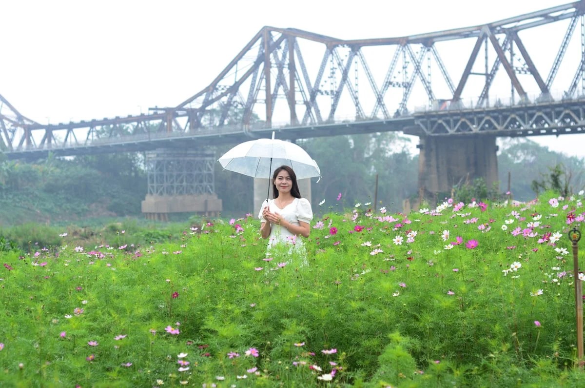 Dù thời tiết Hà Nội những ngày giáp Tết khá lạnh và thất thường, không khí tại bến hoa Phúc Xá vẫn rộn ràng. Từ sáng sớm, nhiều bạn trẻ, các nhóm gia đình và người trung niên đã có mặt, diện áo dài, thuê thợ ảnh để lưu lại khoảnh khắc xuân bên cây cầu Long Biên trăm tuổi, in bóng xuống dòng sông Hồng.
