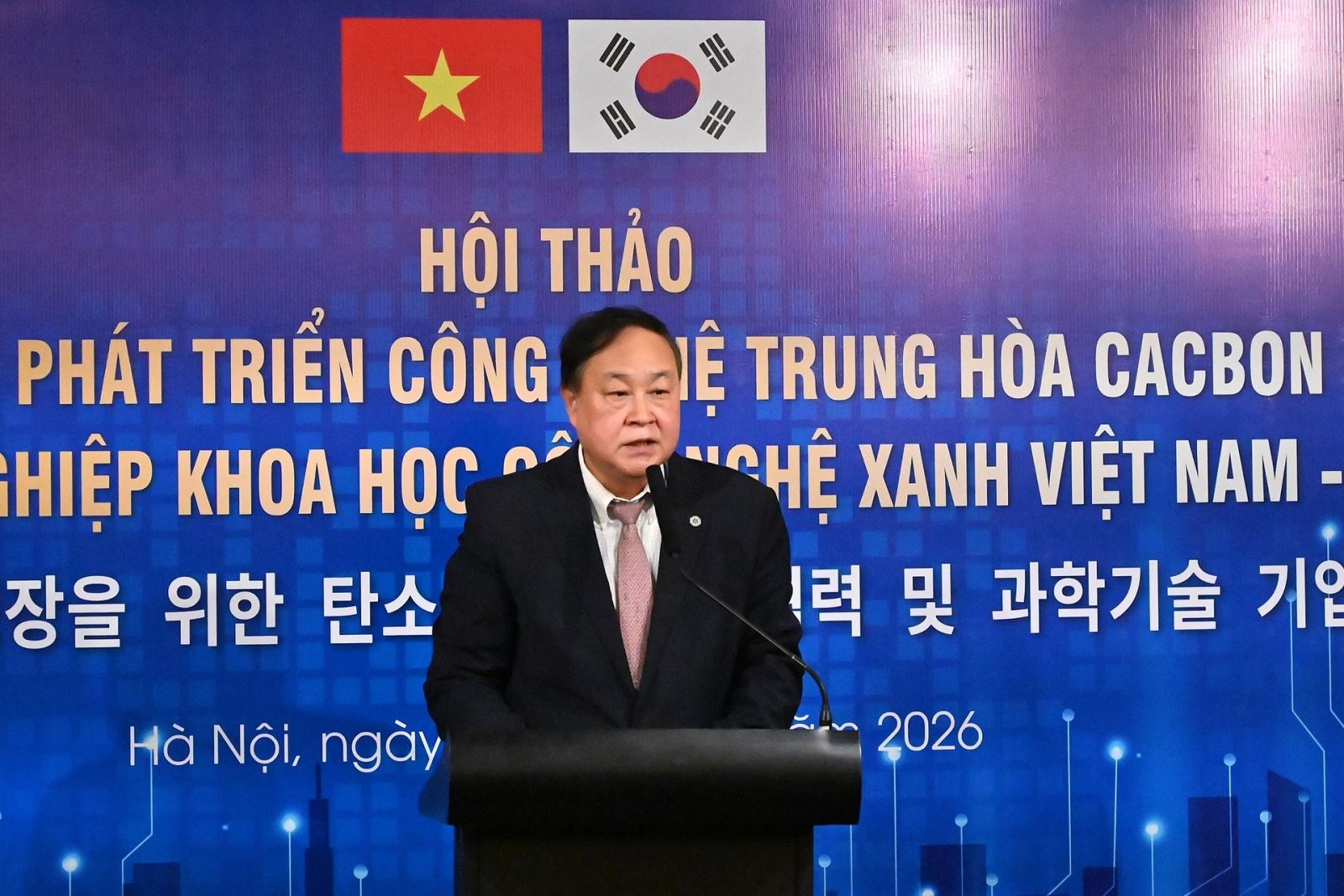 Ông kiến nghị đẩy mạnh các hình thức hợp tác như nghiên cứu khả thi thành lập Trung tâm nghiên cứu trung hòa các-bon Việt Nam - Hàn Quốc; tăng cường kết nối giữa viện nghiên cứu, trường đại học và doanh nghiệp; xây dựng cơ chế tài chính xanh cho các dự án các-bon thấp.