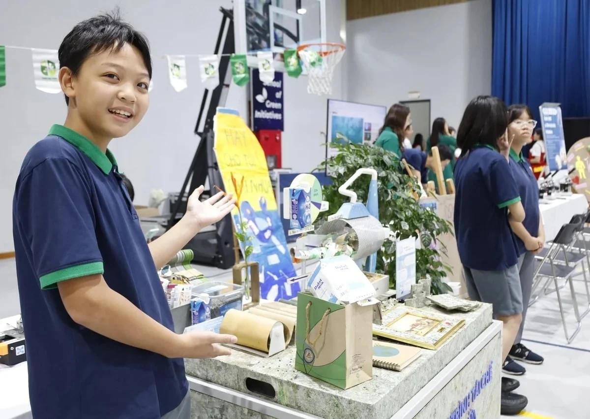 Học sinh Trường Phổ thông Việt Mỹ tham gia phong trào trường học không rác thải nhựa.
