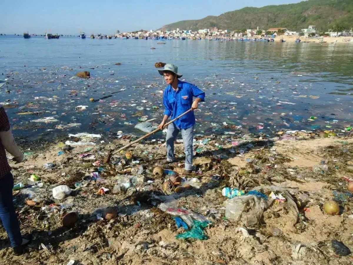 Cảnh bãi biển Nhơn Hải ngập rác thải sinh hoạt hơn 10 năm về trước do thói quen vứt rác xuống biển của người dân.